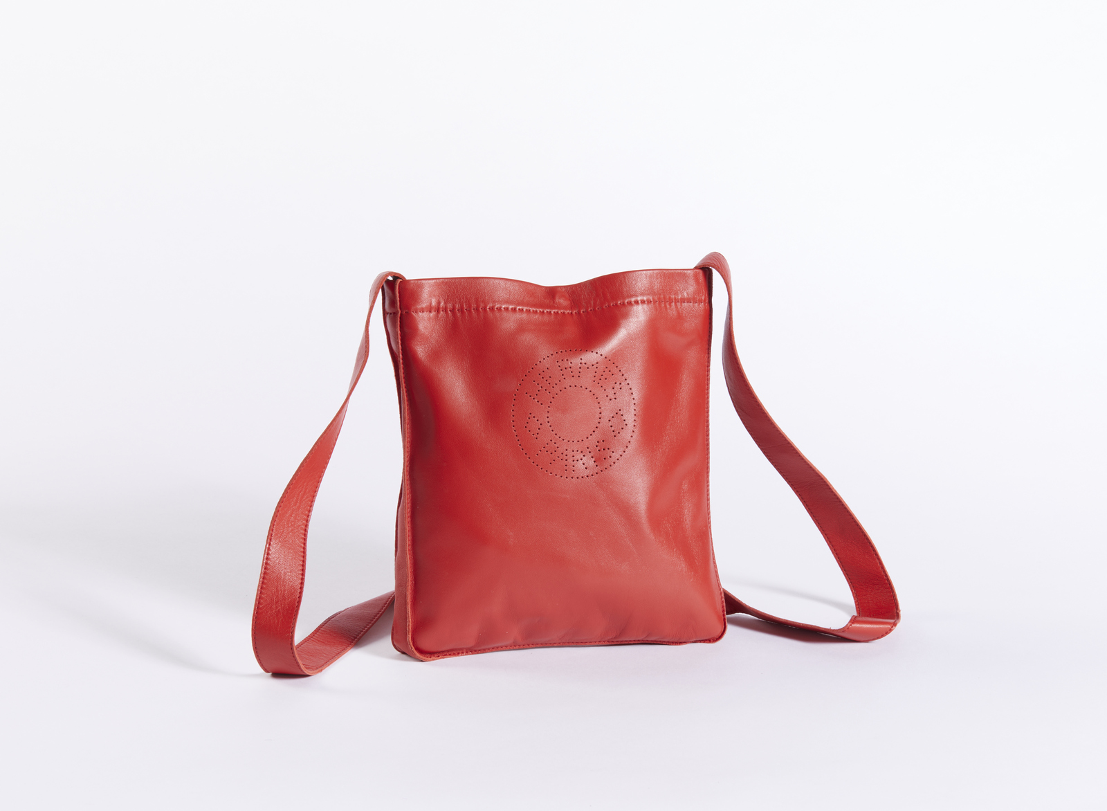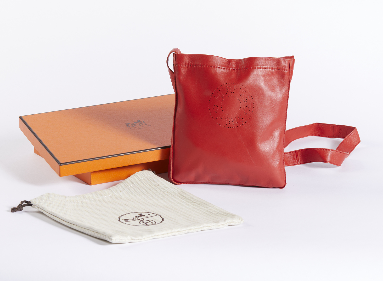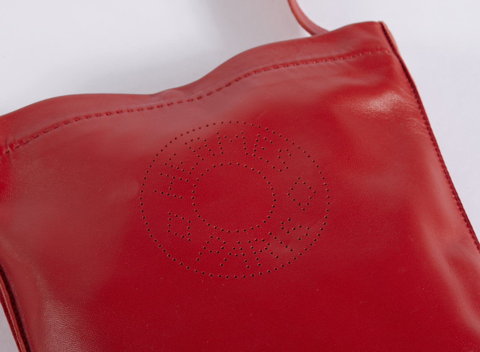 HERMES Borsa in pelle rossa. Pelle. Cm 18,00 x 22,00 x 2,00. Borsa in pelle con tracolla. Logo traforato sul fronte. Chiusura con bottone.