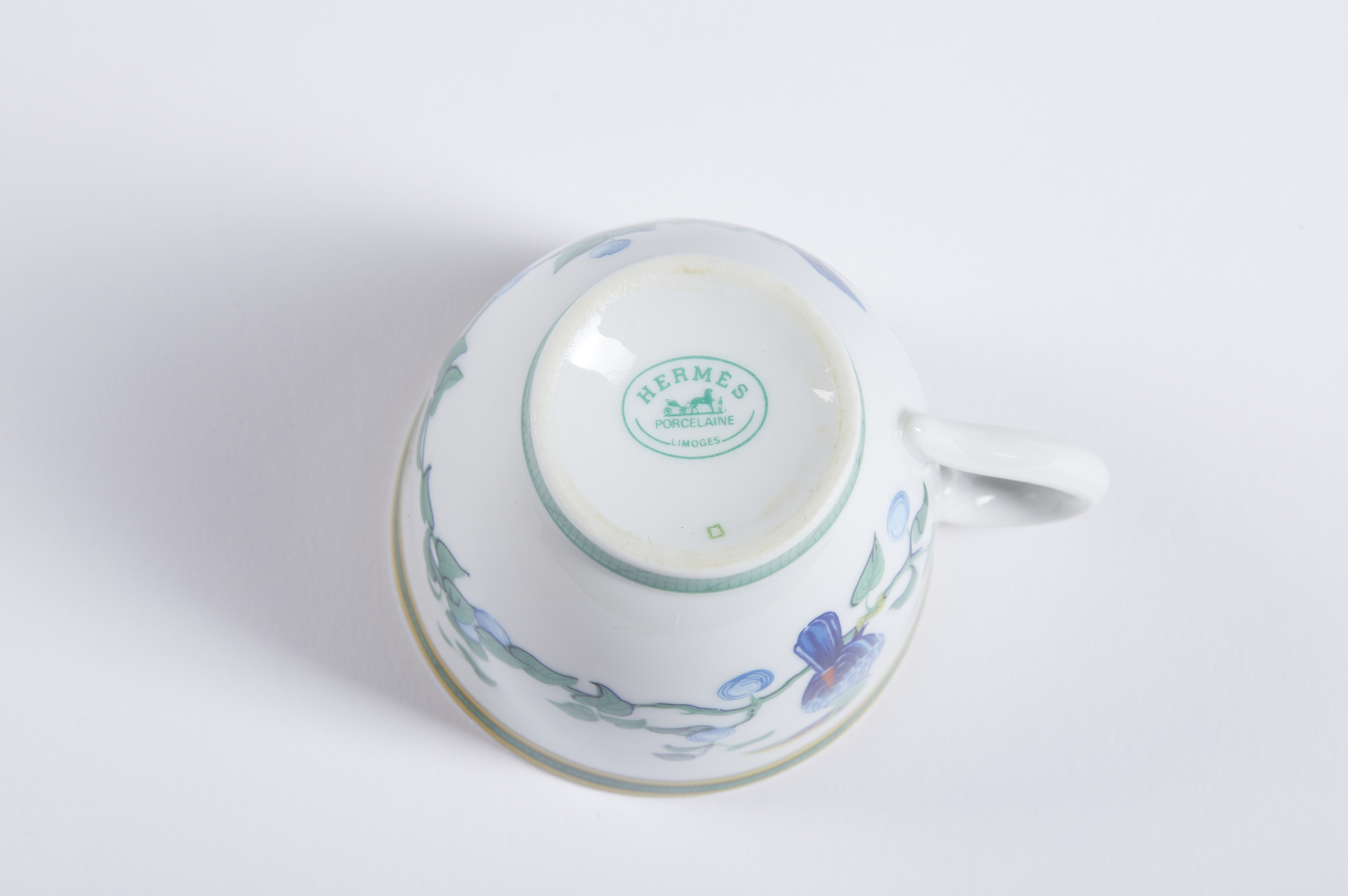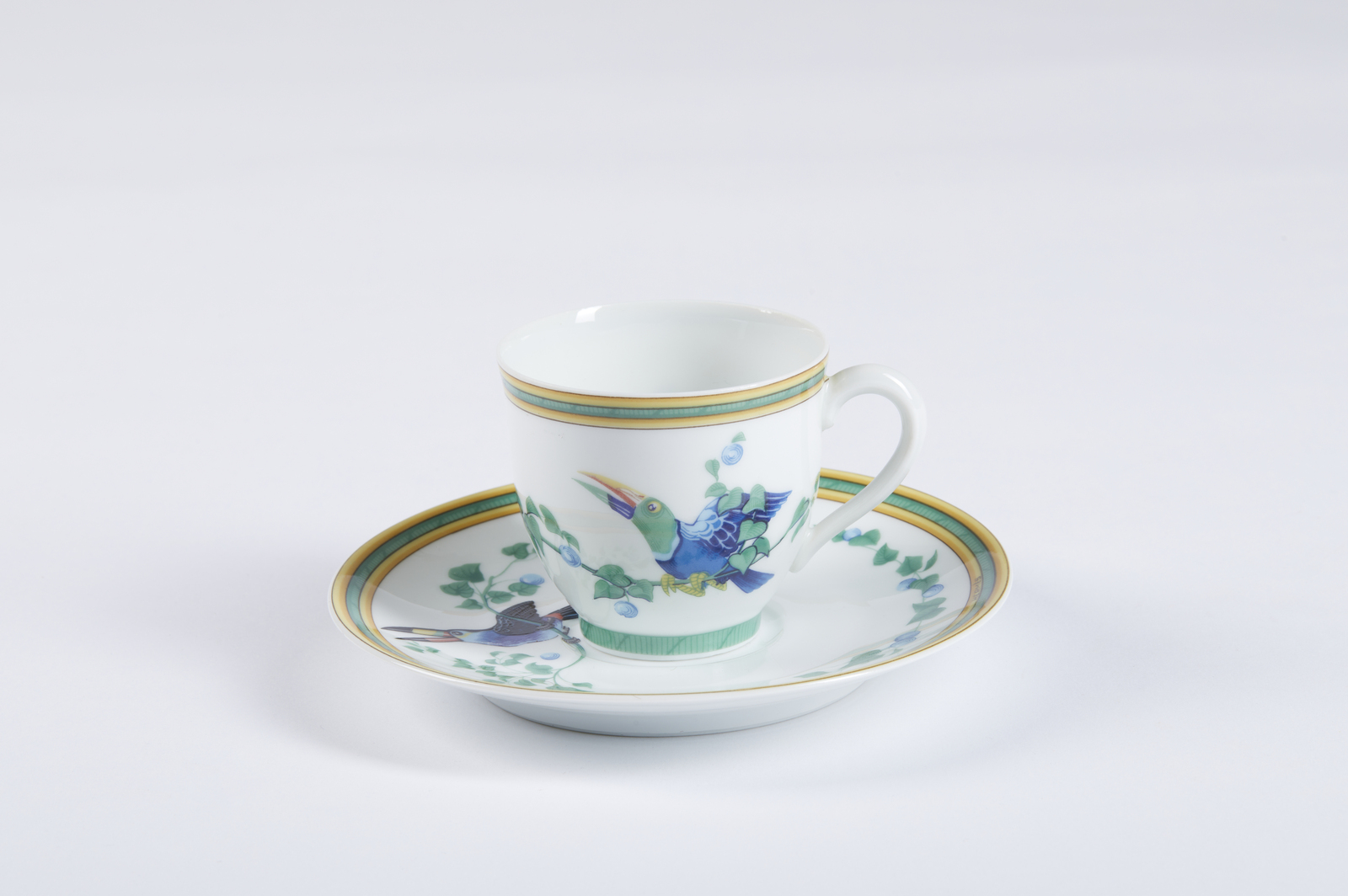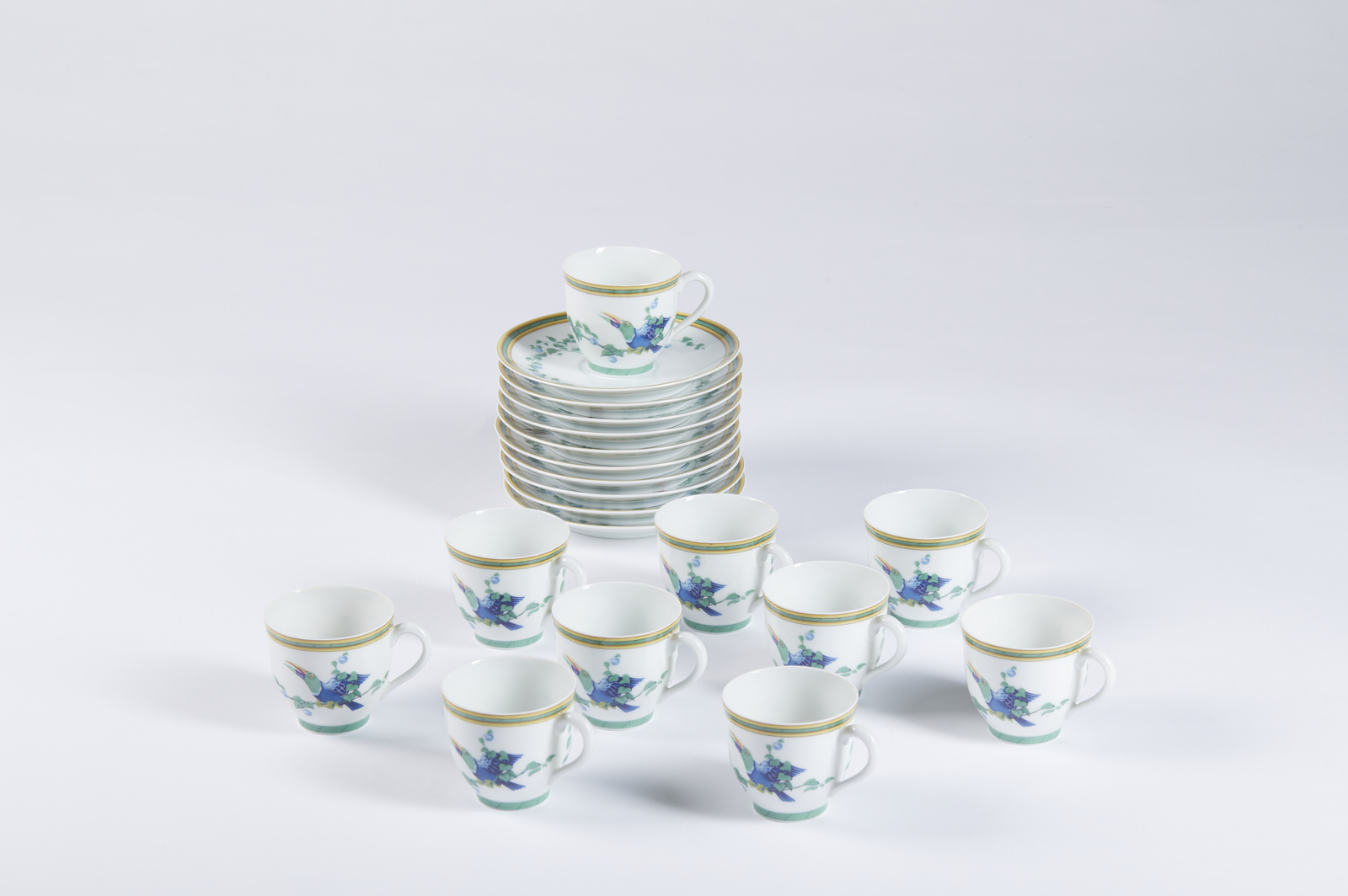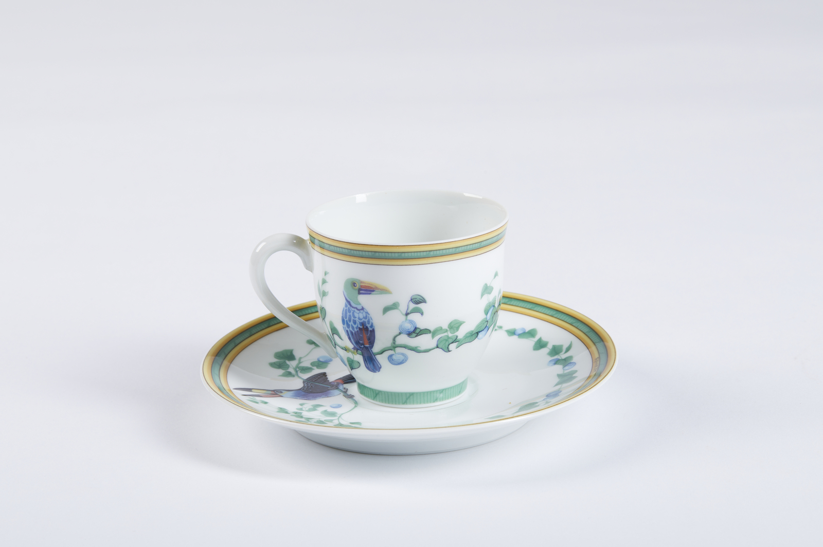 HERMES Porcellana modello Tucano. Porcellana. . Servizio da caffè composto da 10 tazze e 10 piattini. Porcellana policroma. Marca: Toucans; décor original créé dans nos ateliers; Hermès Porcelaine Paris; Hermès Paris France in verde. Ottimo stato di conservazione;
