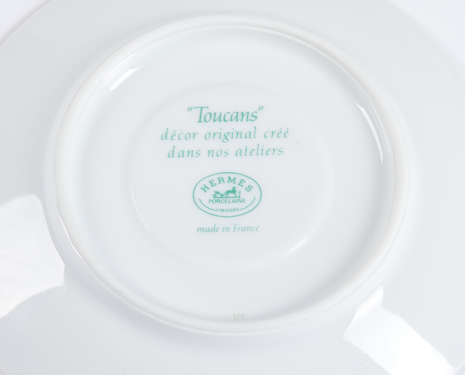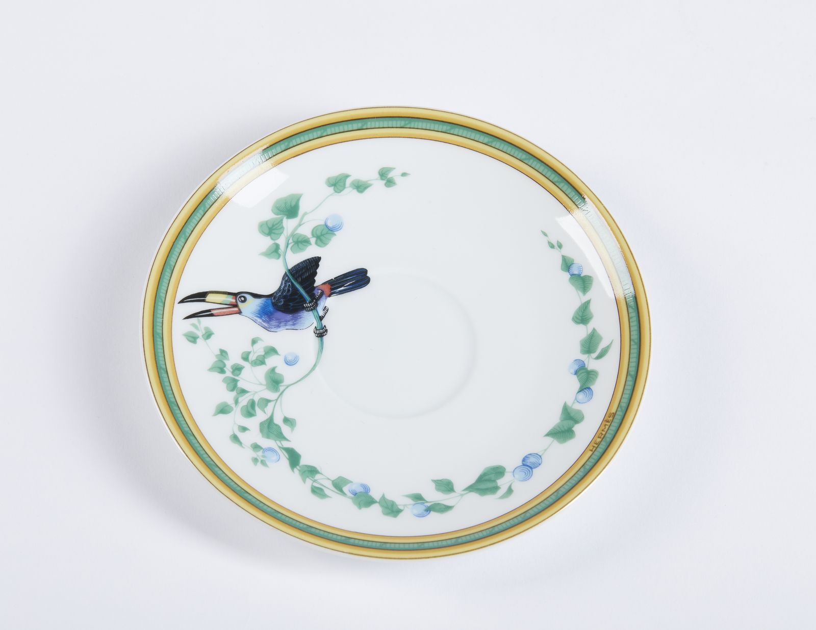 La casa di moda parigina Hermès, fondata nel 1837, si è sviluppata nella creazione di beni di lusso ed articoli per la casa per lo stile di vita. Le porcellane con motivo “Toucans” - ossia con uccelli di tucano blu con becchi multicolori, fogliame verde e fasce gialle e verdi - sono state prodotte dal 1991 al 2017.