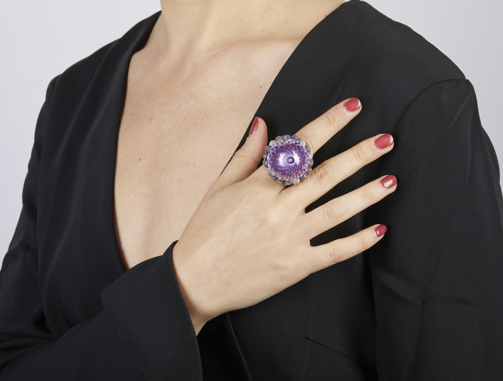 [Nessun Autore] Anello "medusa" con pietra viola. . . Anelloin argento con pietra viola centrale. Montatura con zirconi.