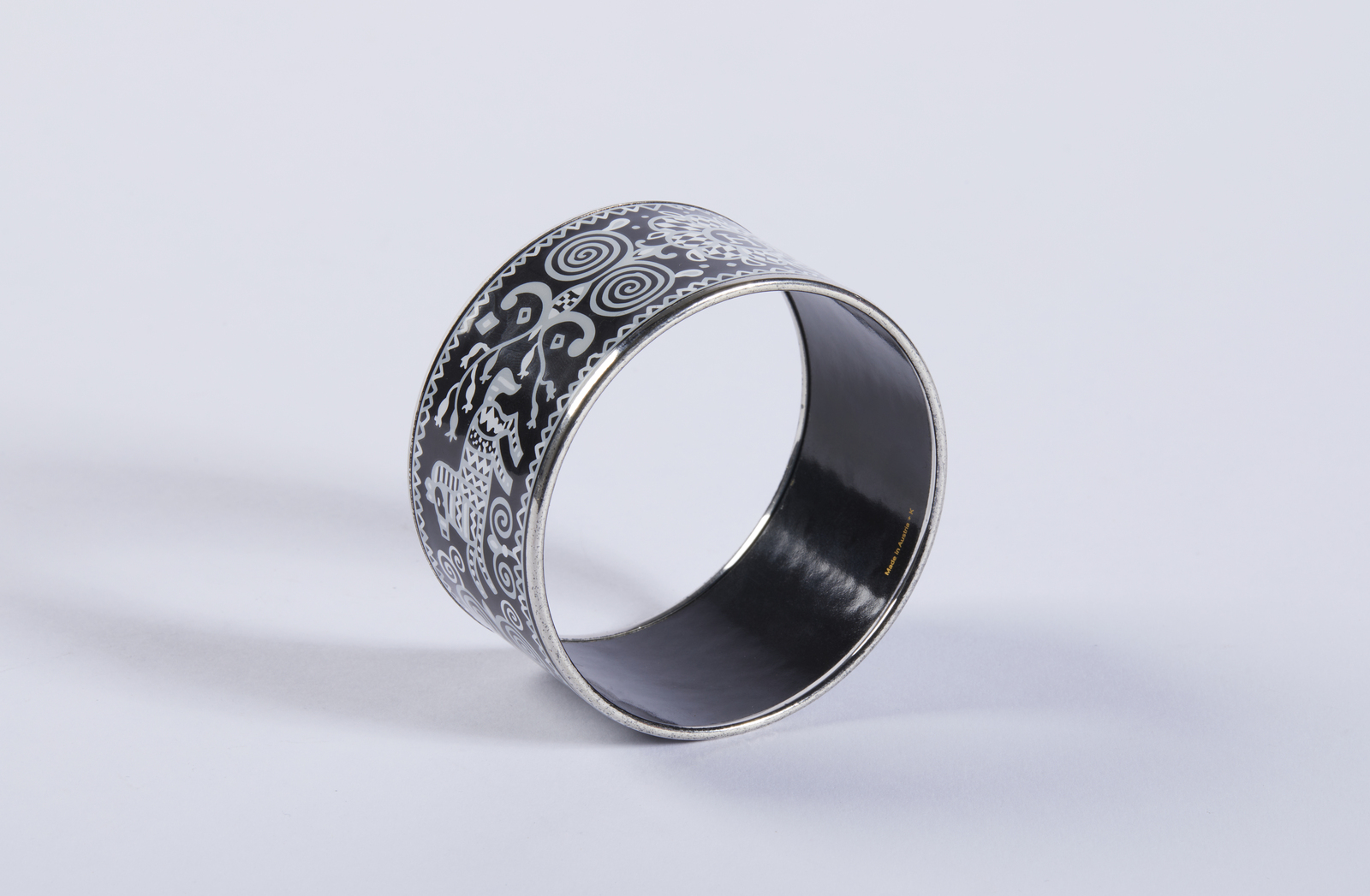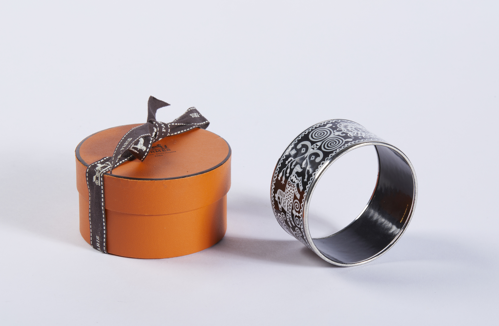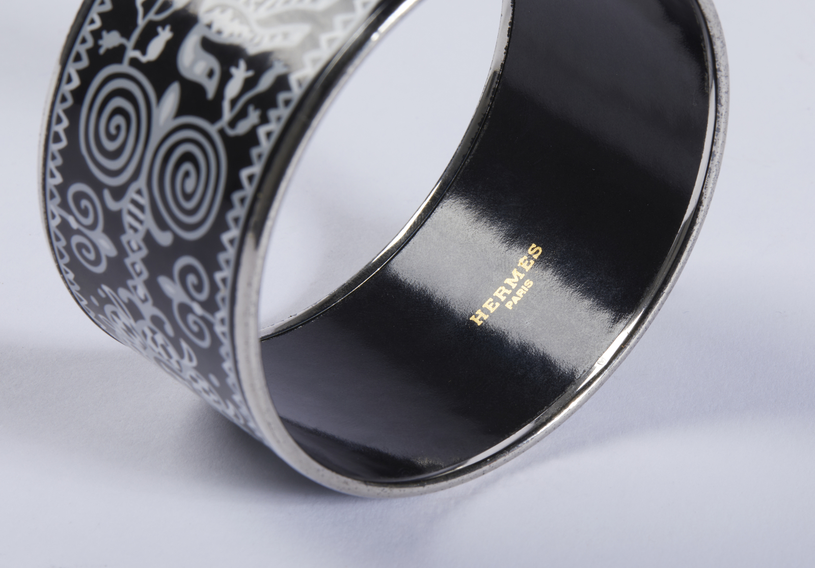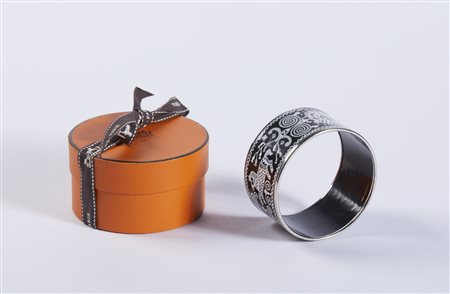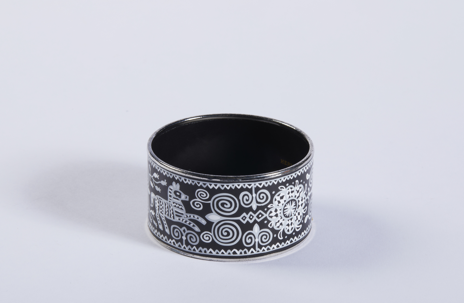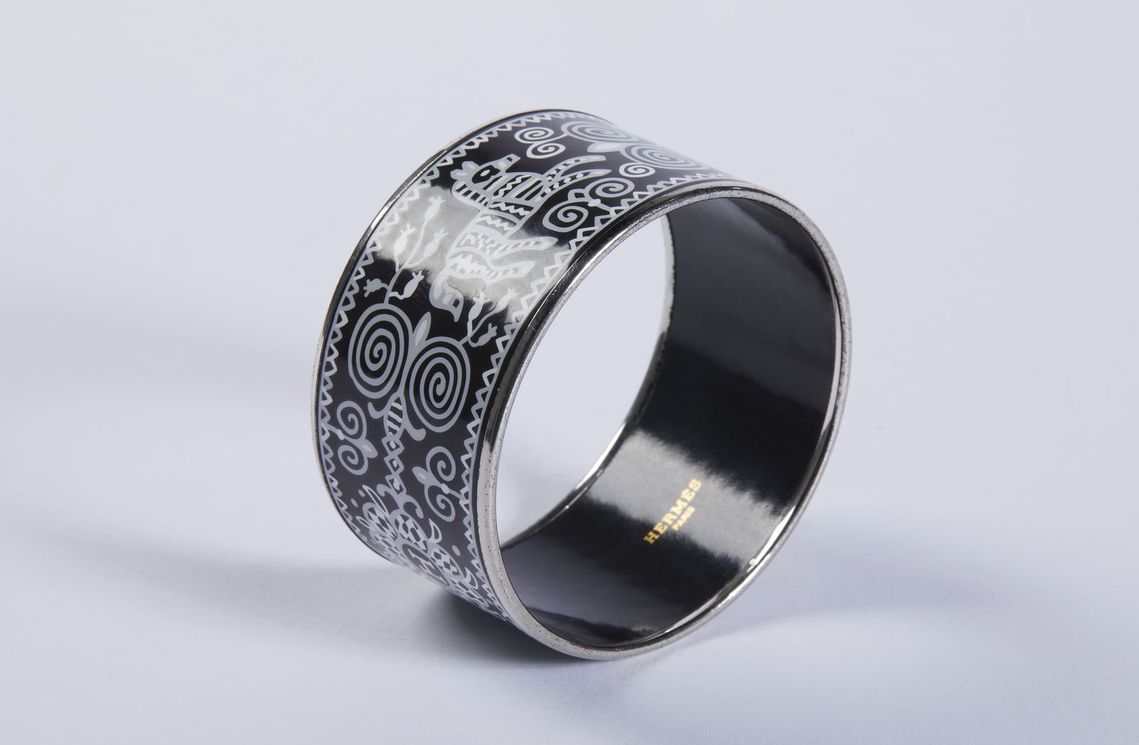 HERMES Bracciale in metallo fondo di colore nero e decori grigi. . . Bracciale in metallo decorato nei toni del nero e del grigio; raffigurante motivi geometrici concentrici e cavalli.