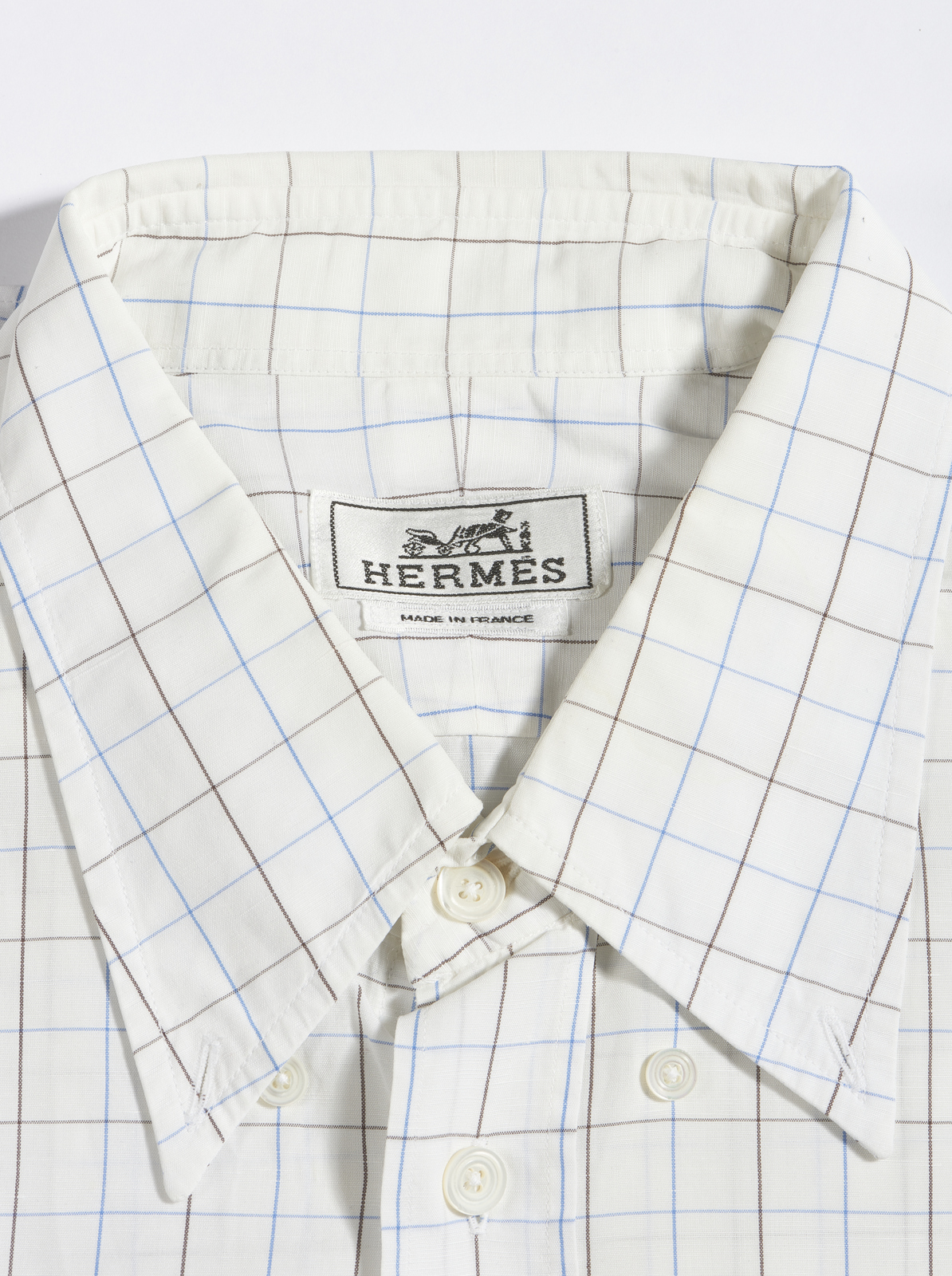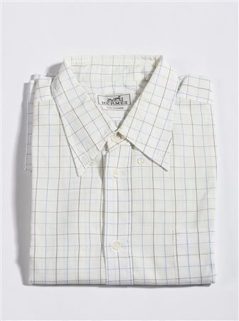 HERMES Camicia da uomo. . . Camicia con fondo bianco e quadretti nei toni dei marrone e azzurro. Bottoni gemelli a chiusura dei polsini.