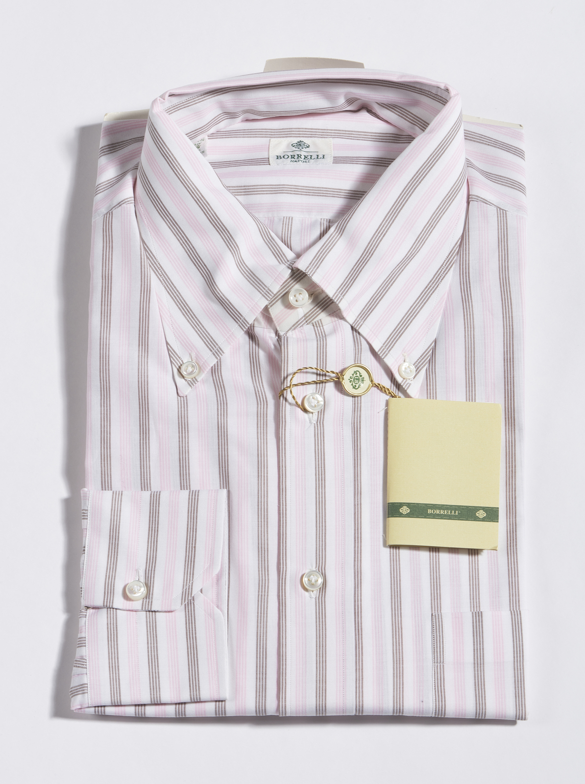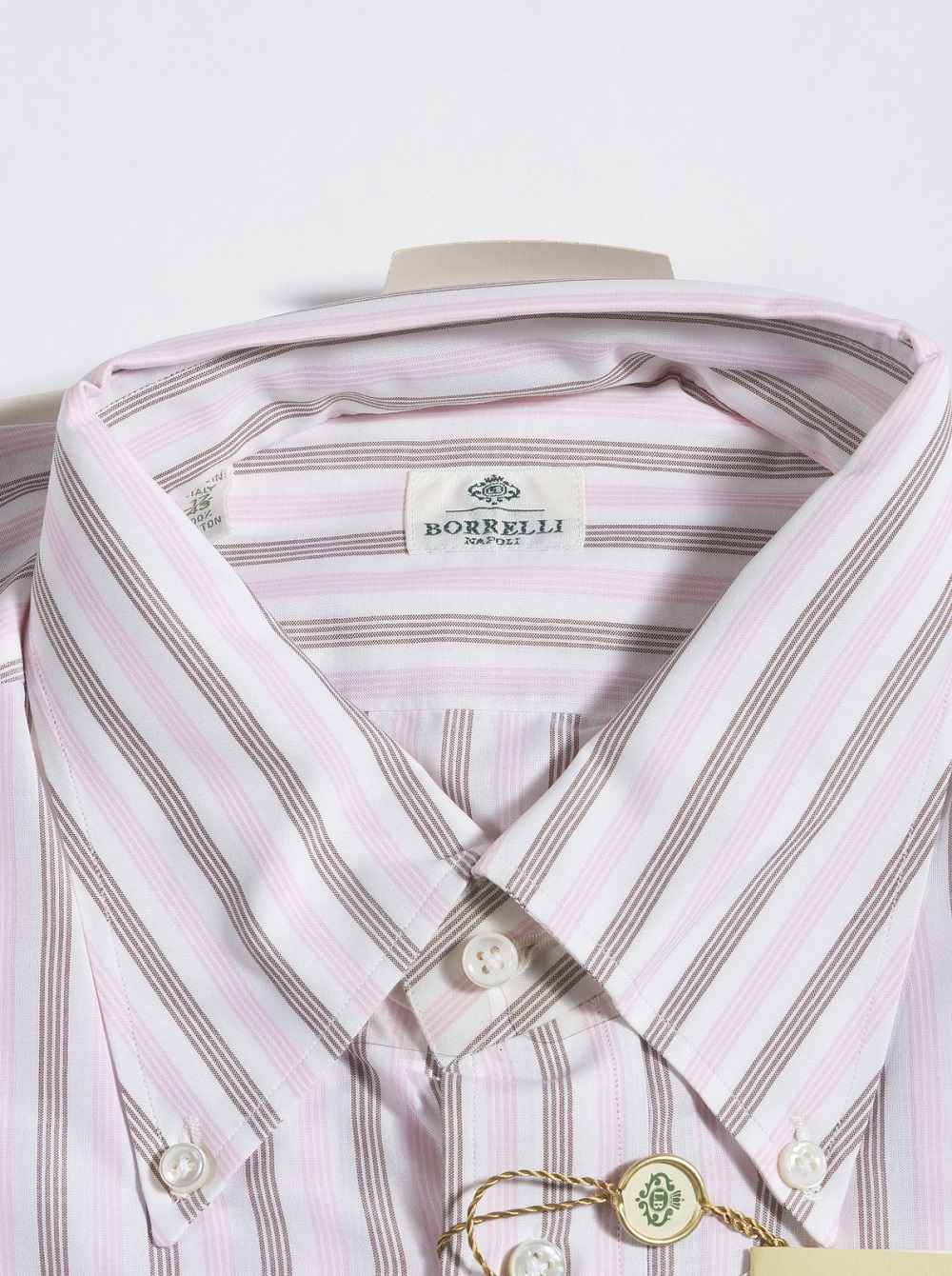 BORRELLI Camicia a righe. . . Camicia a righe bianche , rosa e marroni con maniche lunghe. Composizione: 100% cotone; taglia 17/43