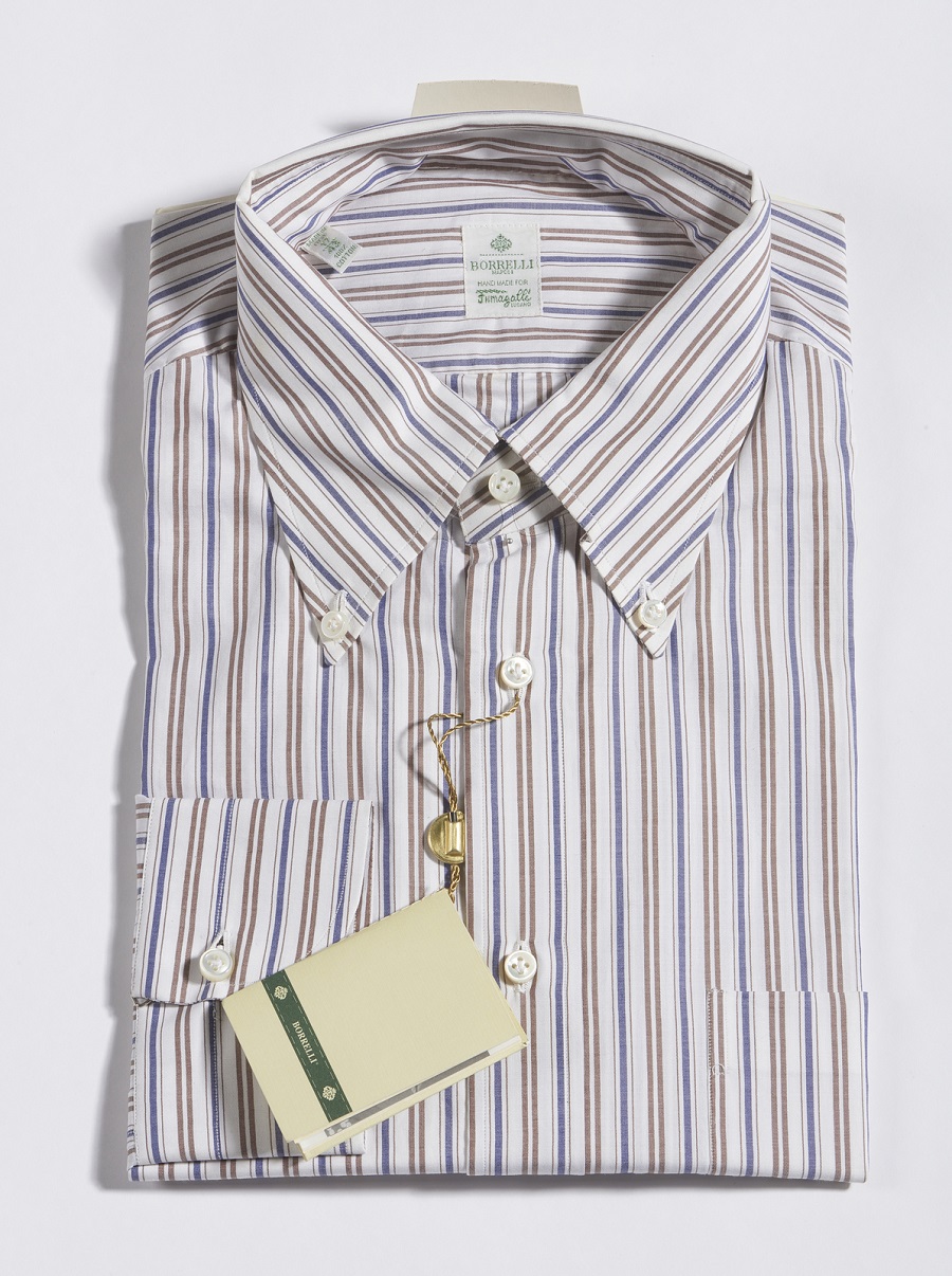 BORRELLI Lotto composto da due camicie. . . Le due camicie sono entrambe a righe con maniche lunghe. La prima con righe rosse, blu e bianche; la seconda con righe marroni, blue e bianche.