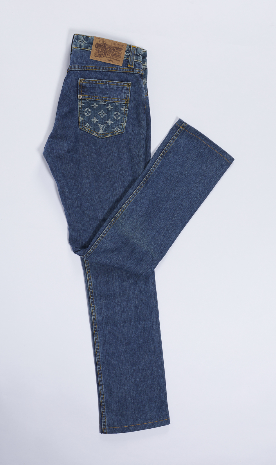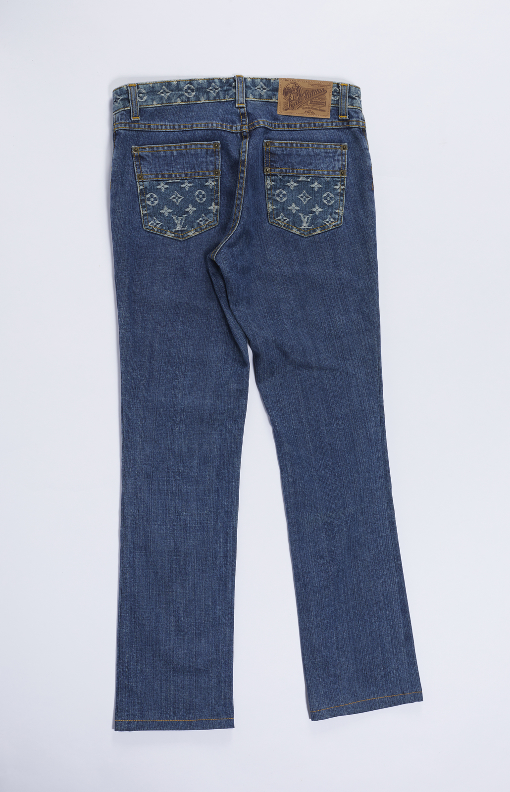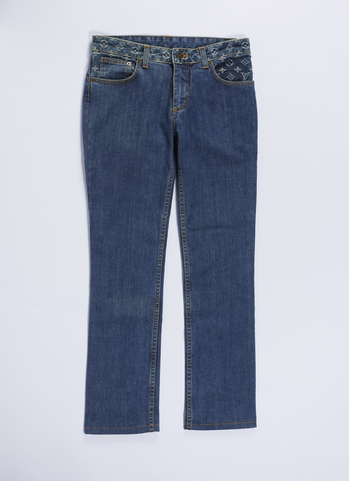 VUITTON LOUIS Jeans blu. . . Jeans blu decorato sulle tasche con logo LV. Cuciture di color giallo.