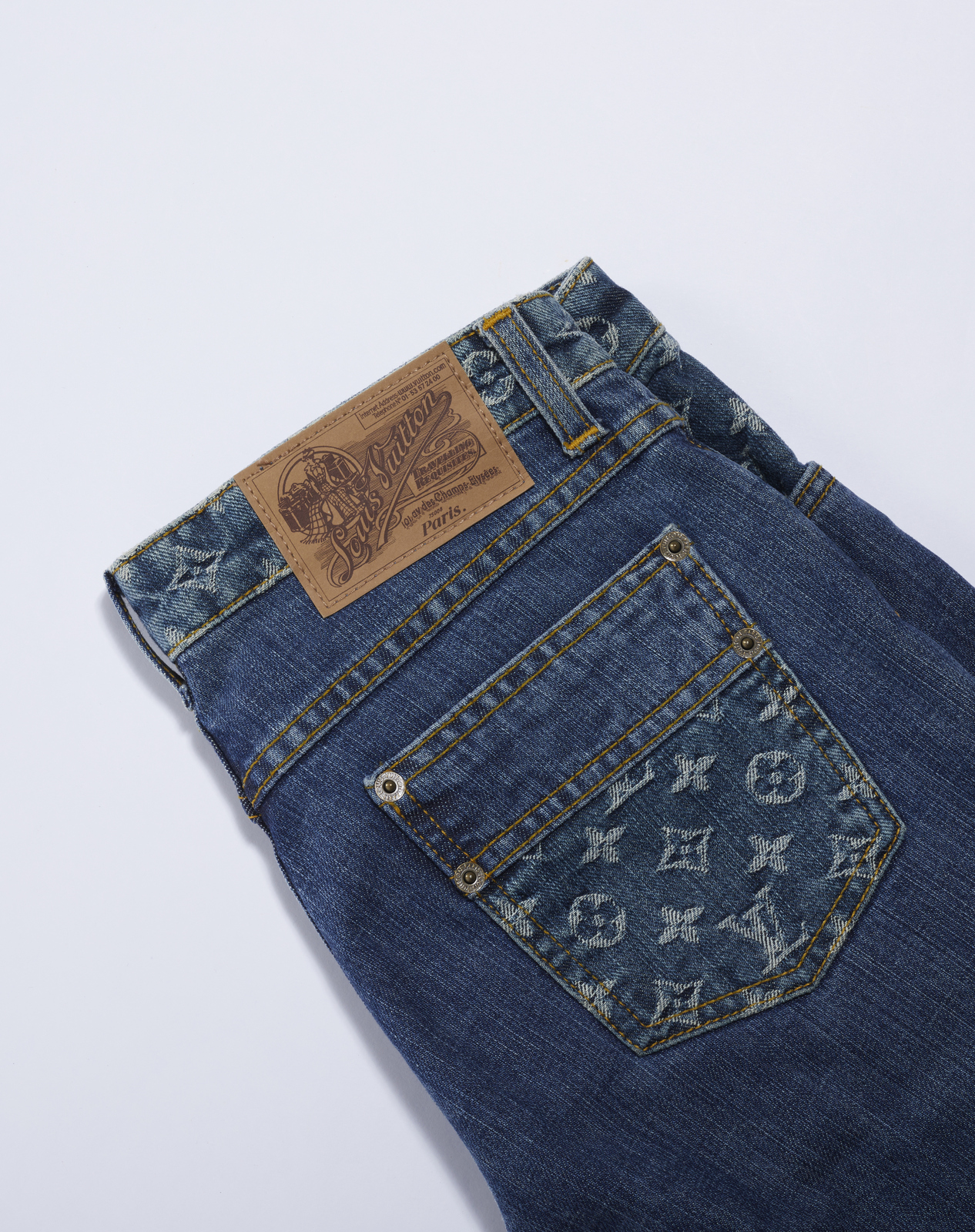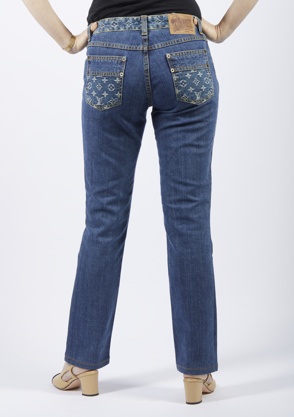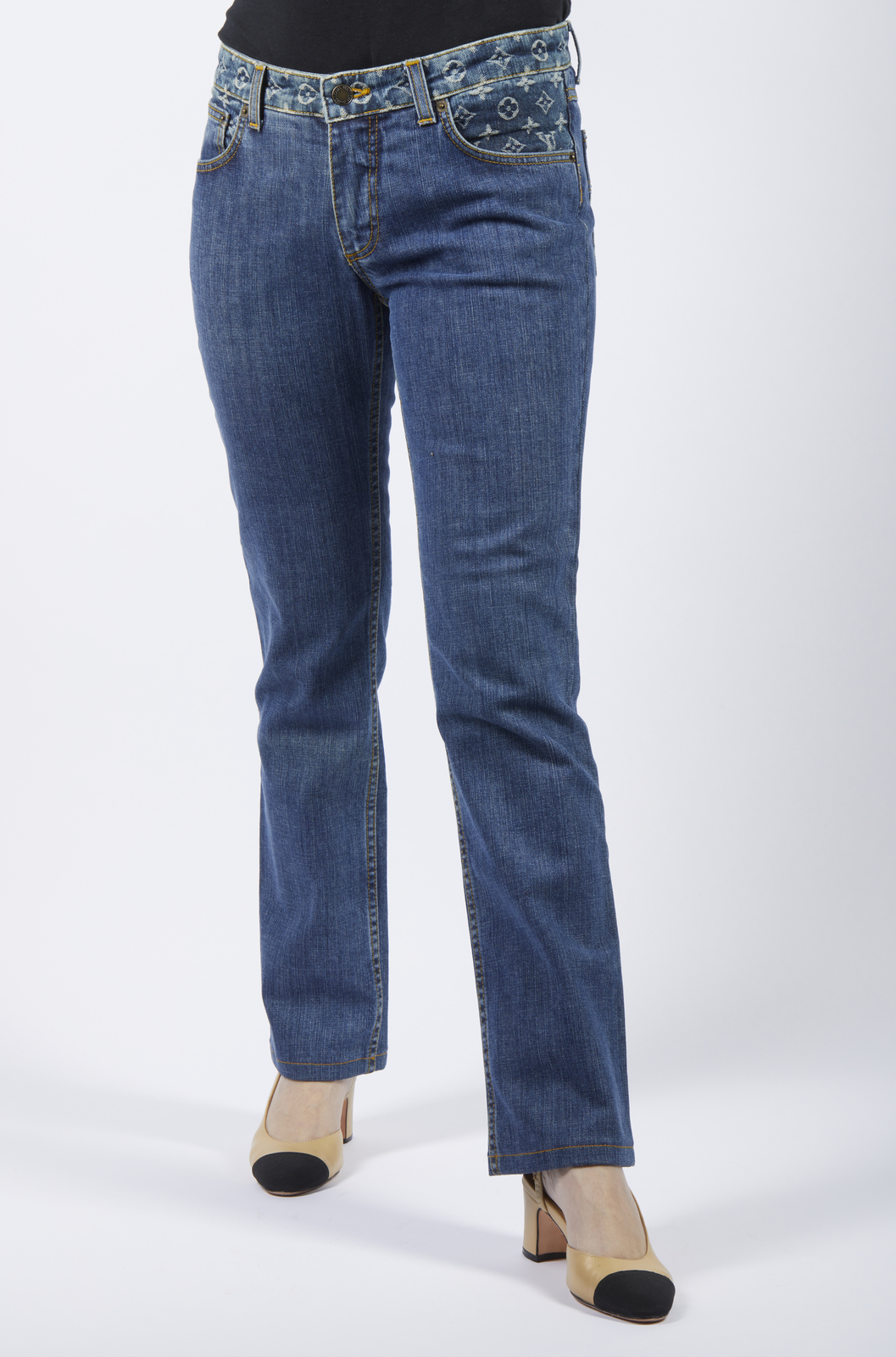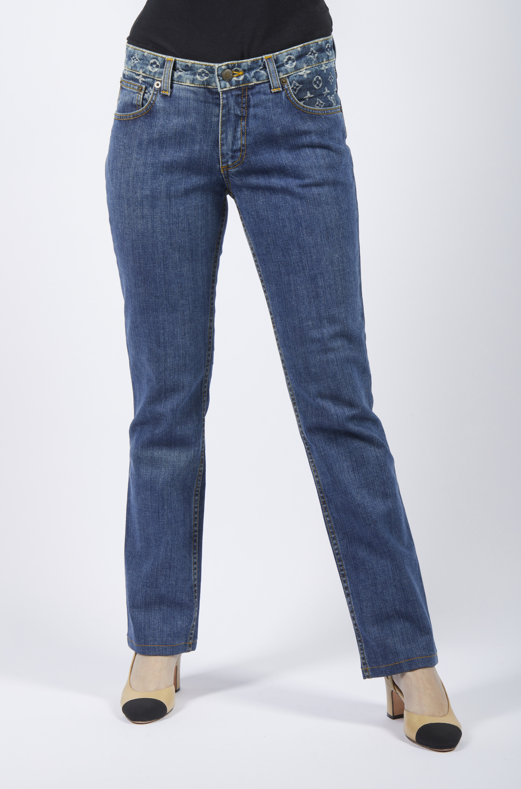 VUITTON LOUIS Jeans blu. . . Jeans blu decorato sulle tasche con logo LV. Cuciture di color giallo.