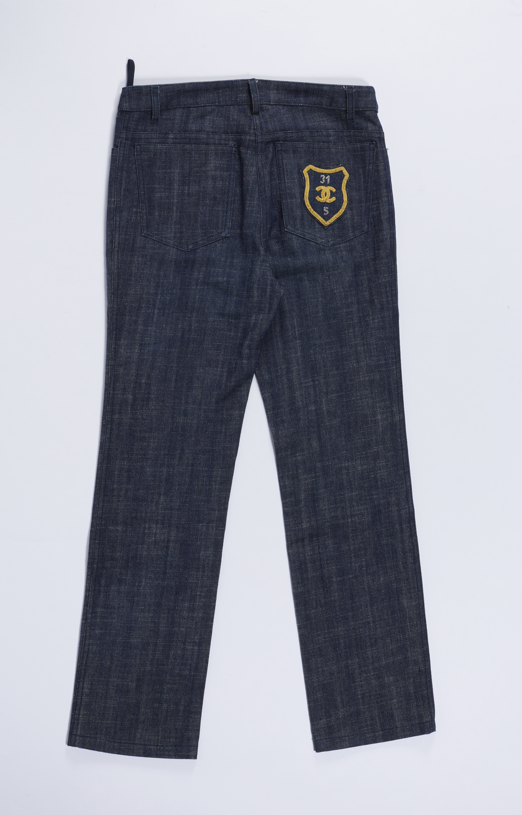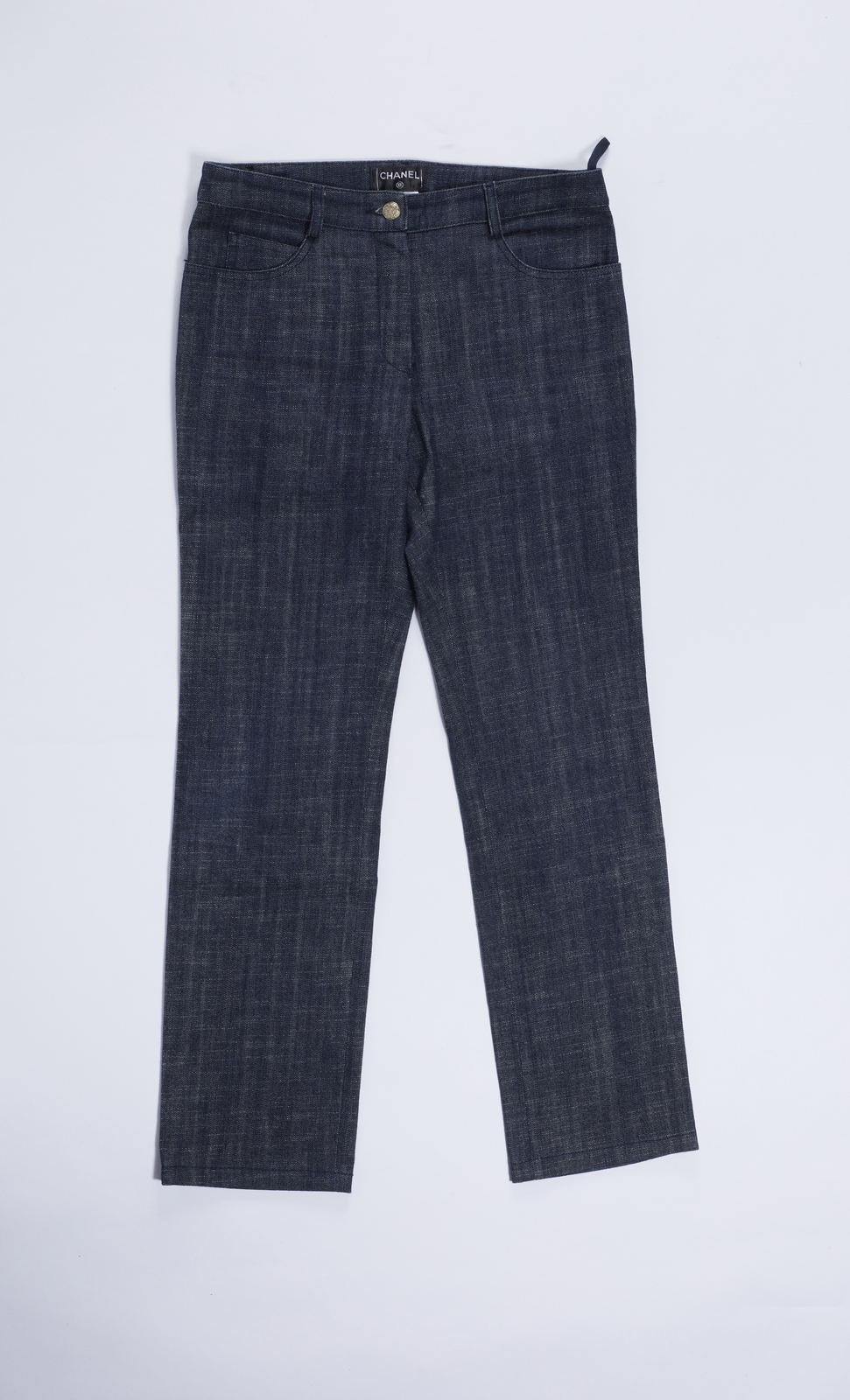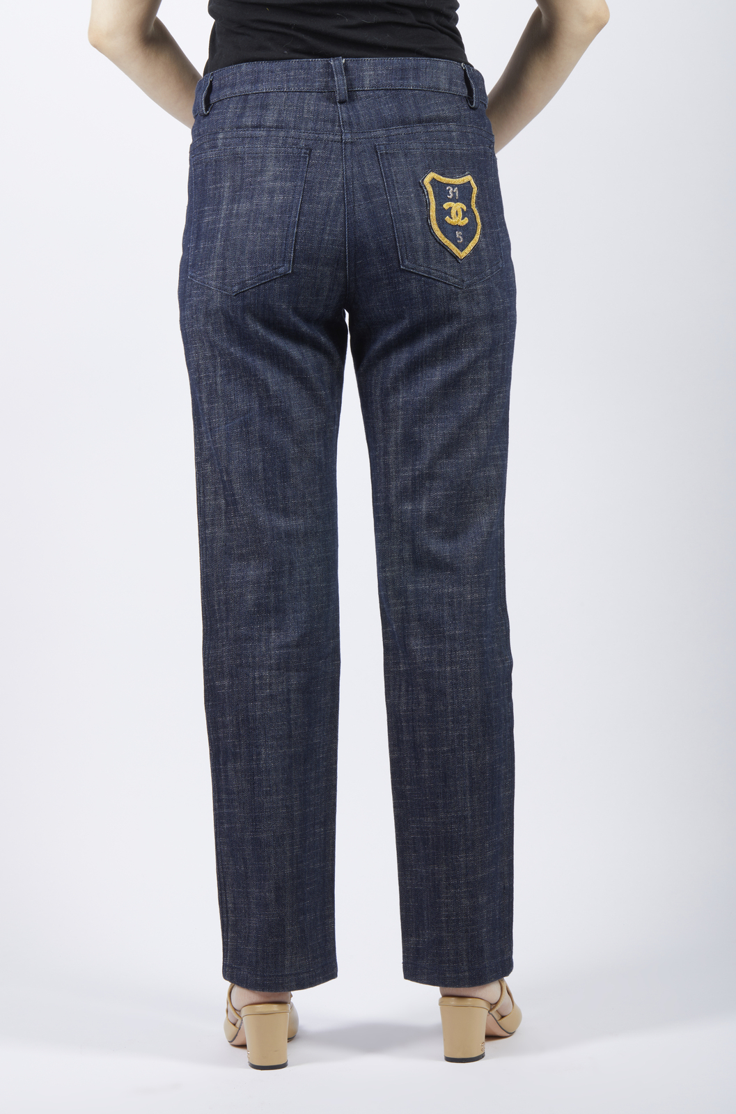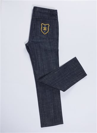 CHANEL Jeans blu . . . Tasca decorata sul retro con logo Chanel. Taglia 30 IT: cavallo 70 cm; vita 40cm. La modella solitamente indossa una taglia 38 italiana.