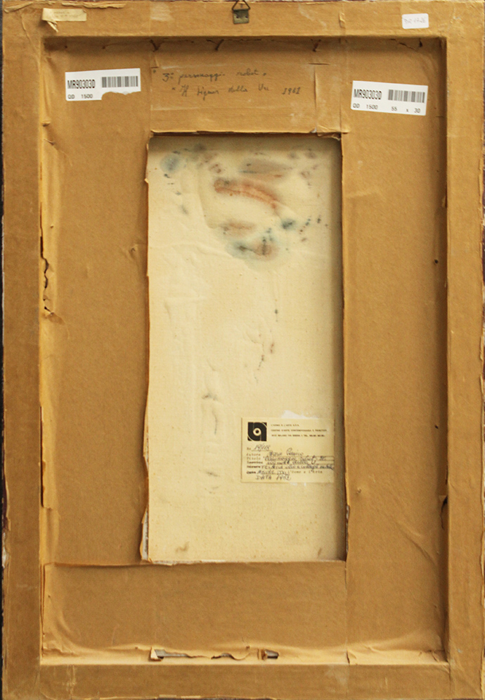 MARIO PERSICO, "Personaggio Robot-Il Signore della U", 1961, olio e collage su tela, dim 55x30. Al fronte: firma e anno in basso a destra. Al verso: in alto al centro titolo e anno. In basso a sinistra etichetta della Galleria L'Uomo e L'Arte SPA Centro d'Arte Contemporanea e Primitiva, Milano: nome autore, titolo, tecnica, misure, anno. Opera con cornice.