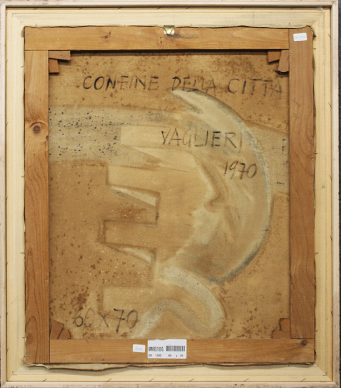 CELESTINO DETTO TINO VAGLIERI, "Confine della città", 1970, olio su tela, dim 70x60 cm. Opera con certificato. Al fronte: firma e anno in basso a destra. Al verso: titolo, firma e anno in alto e dimensione in basso a sinistra. Opera con cornice.