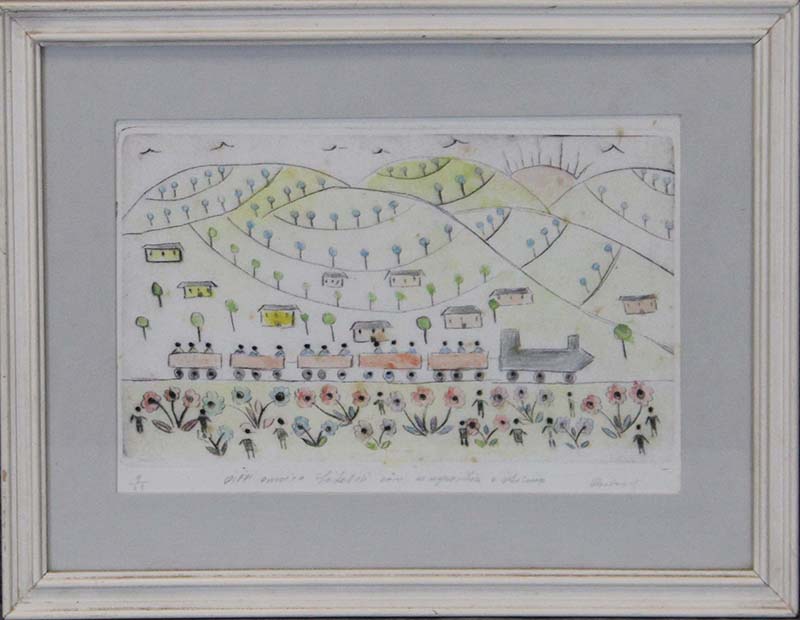 ALDO ORDAVO, Incisione colorata a mano su cartoncino, Dim. 14x22, Al fronte: esemplare 9/21 in basso a sinistra, dedica ad personam al centro in basso, firma in basso a destra, Opera con cornice