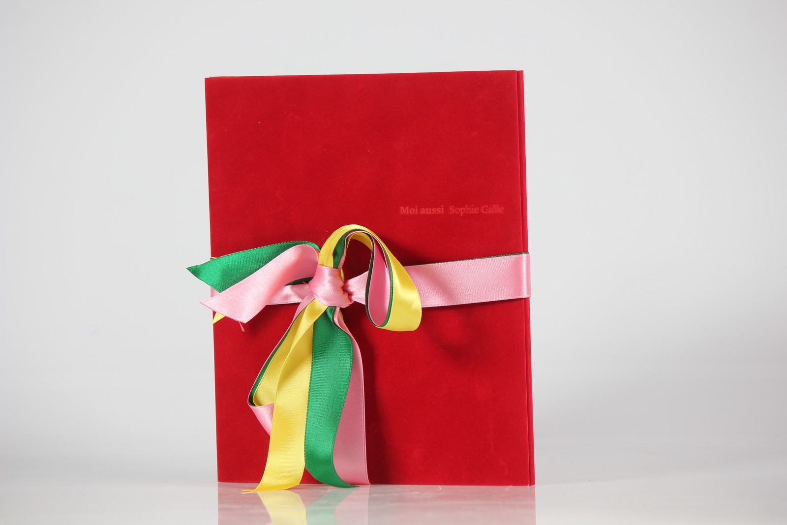 CALLE SOPHIE (n. 1953) Moi Aussi. Libro. Cm 19,50 x 23,50 x 1,50. Edizione 591, copertina in velluto rosso e nastri colorati.
