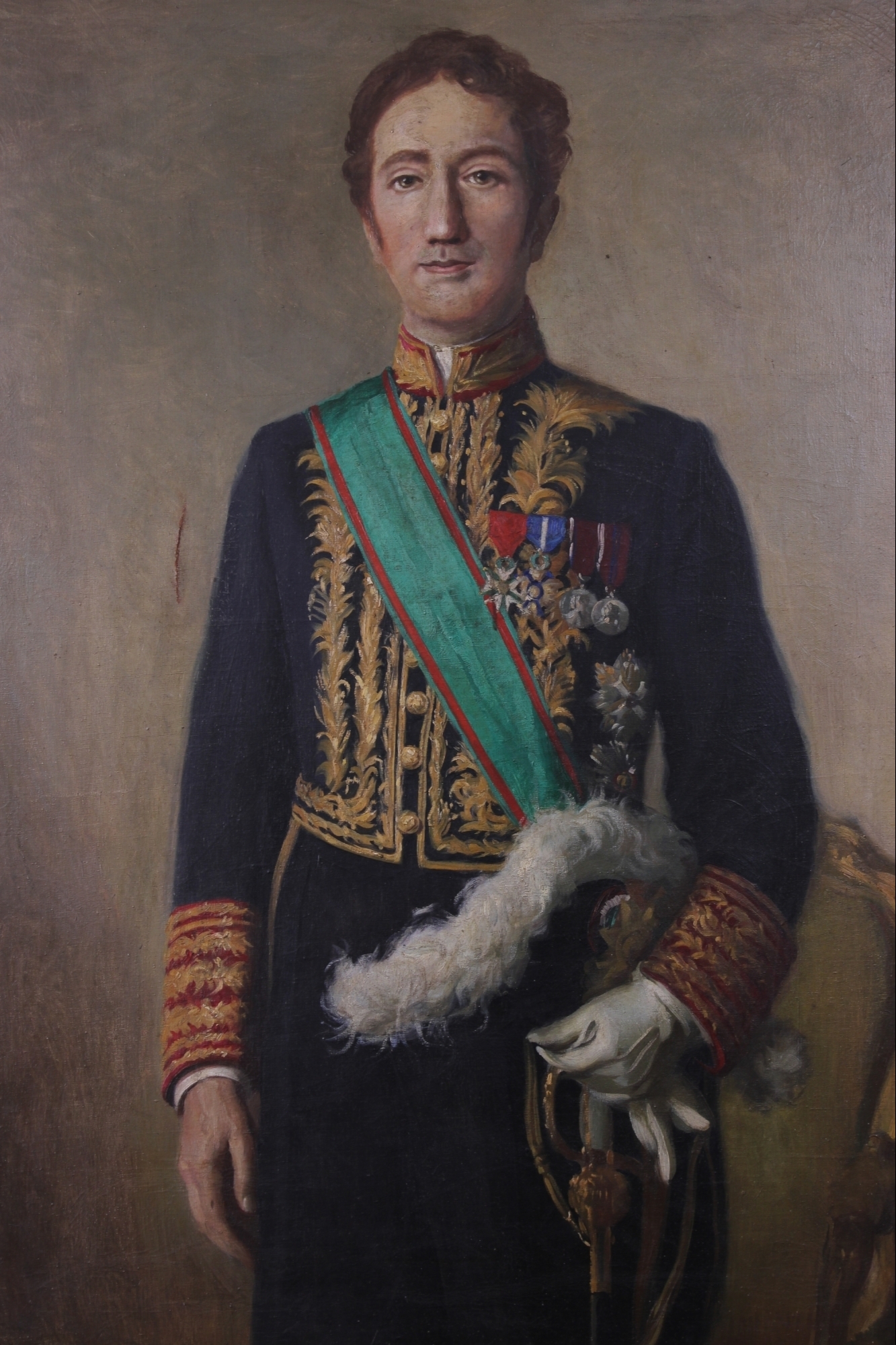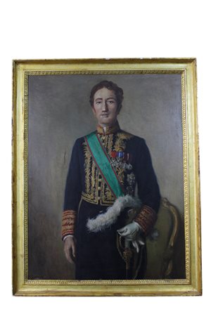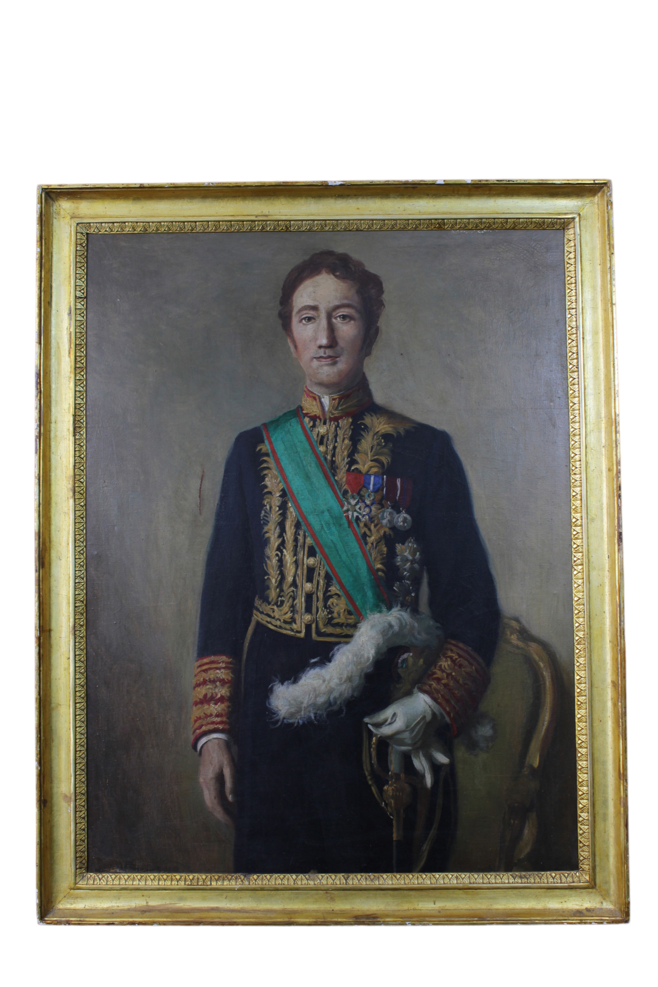 OLIO SU TELA raffigurante ufficiale in alta uniforme dentro bella cornice a canna ciaccata in legno dorato ad argento e mecca, restauri Sicilia XIX secolo h cm 125 x 95 / cornice h cm 140 x 110