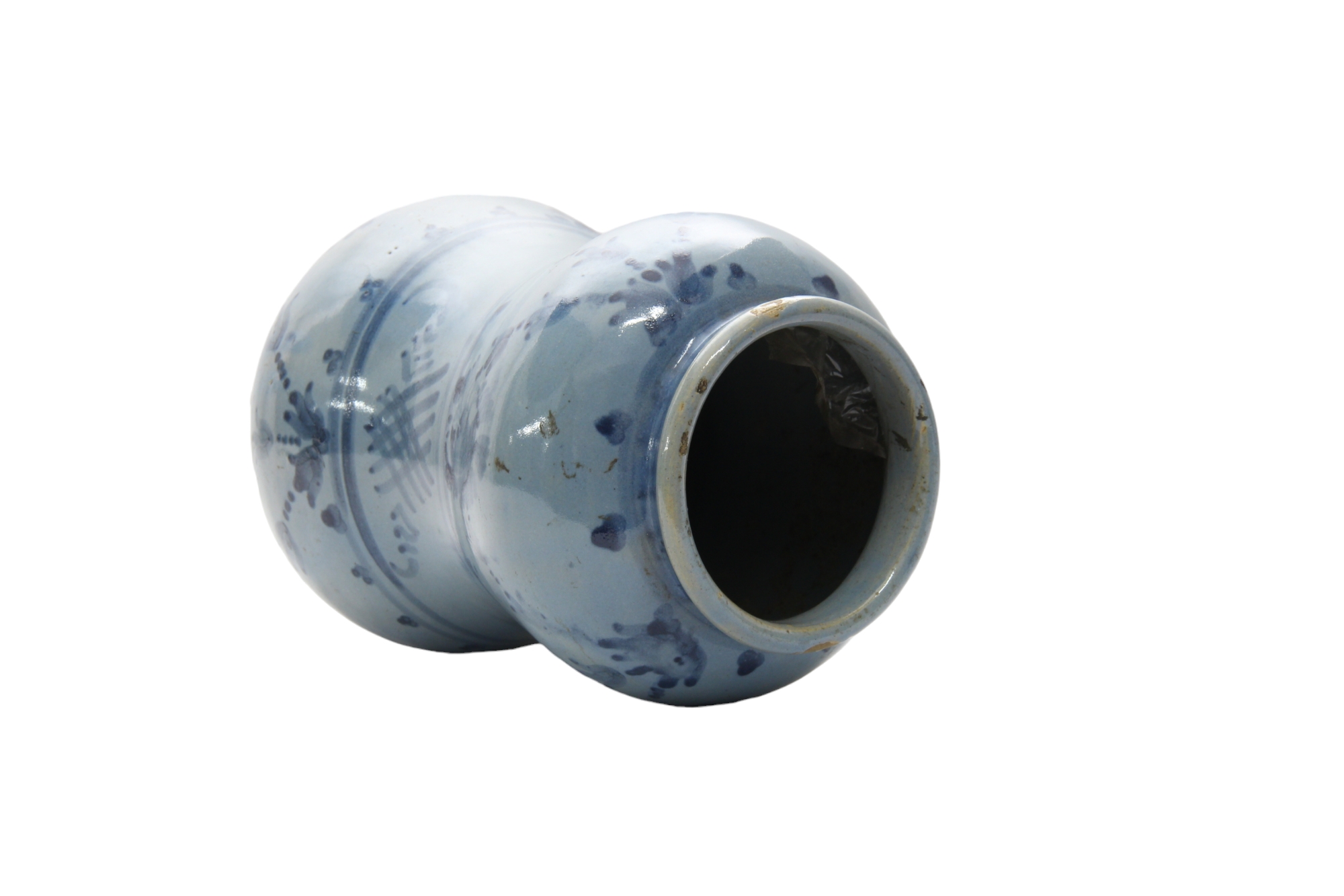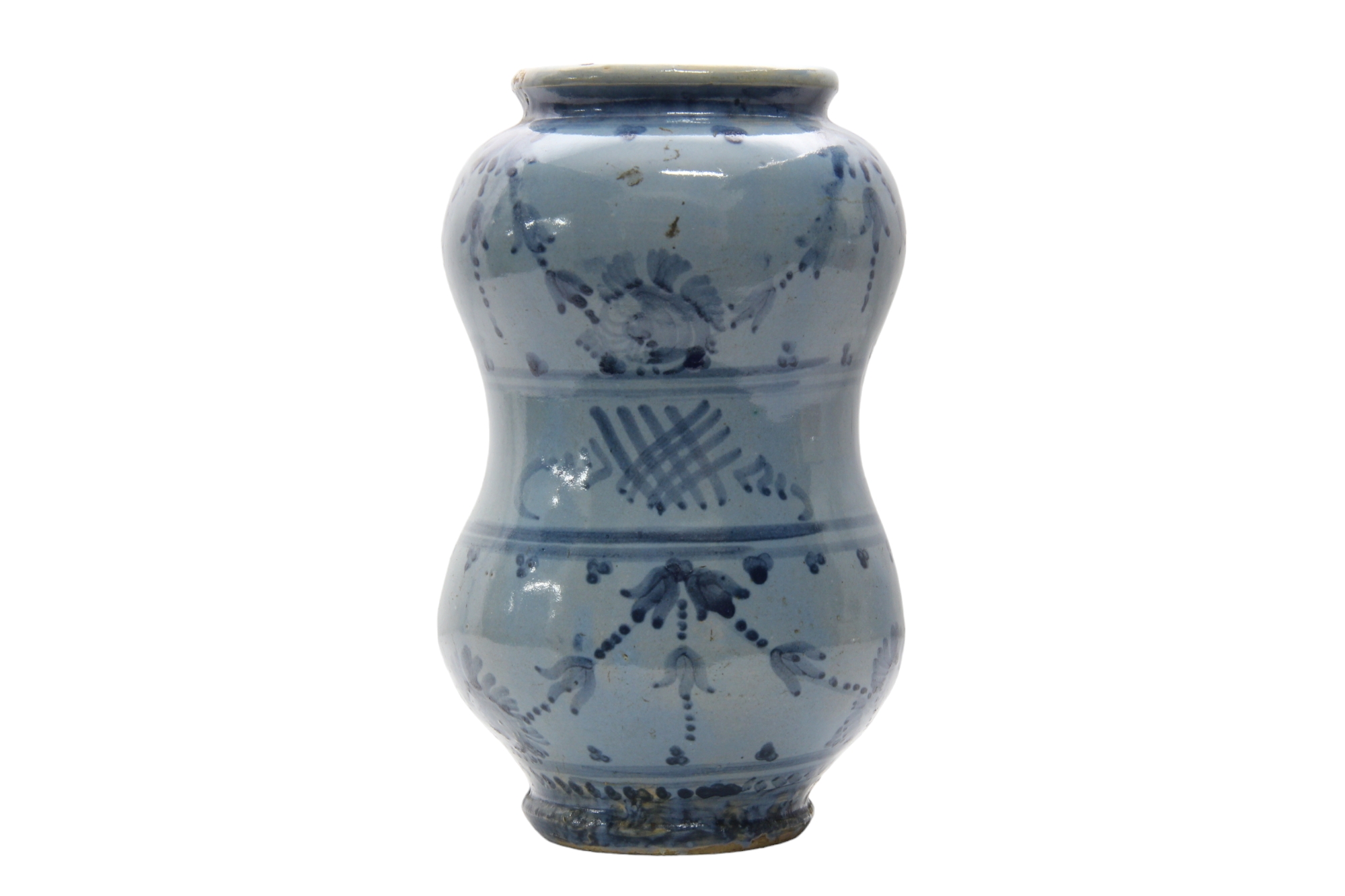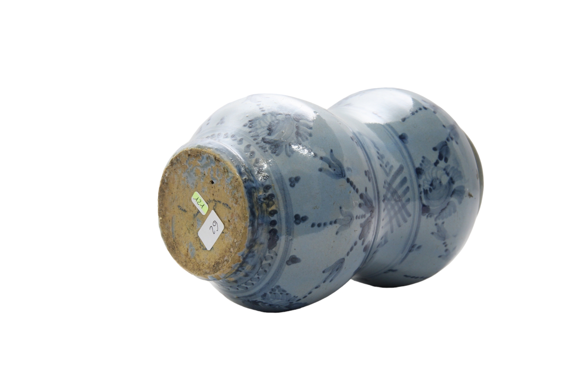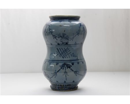 ALBARELLO DA FARMACIA in maiolica a fondo blu decori fogliacei Liguria 1710 circa h cm 20 x 12,5