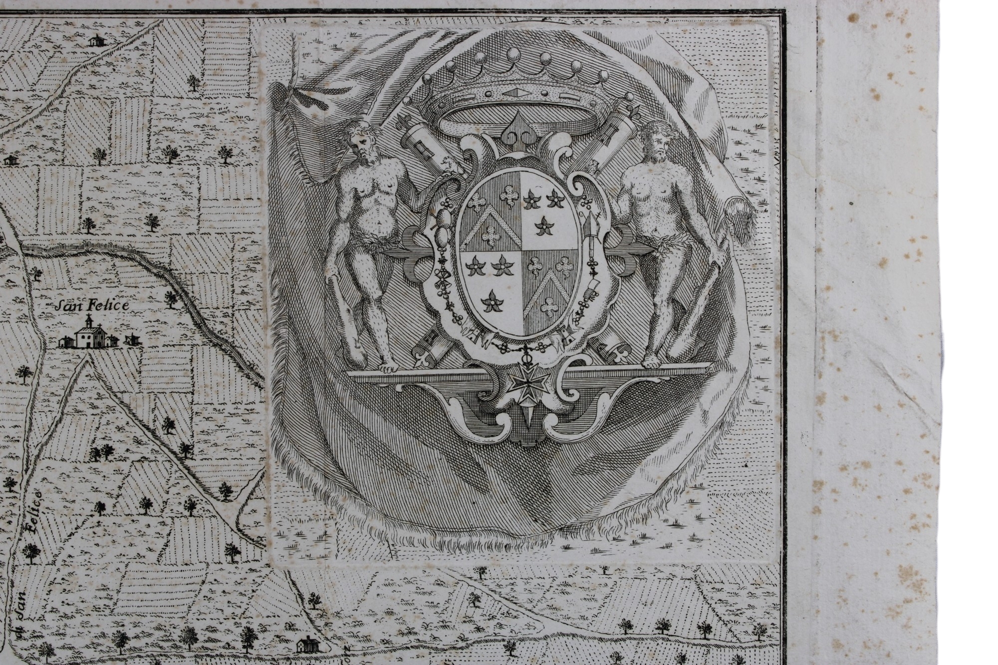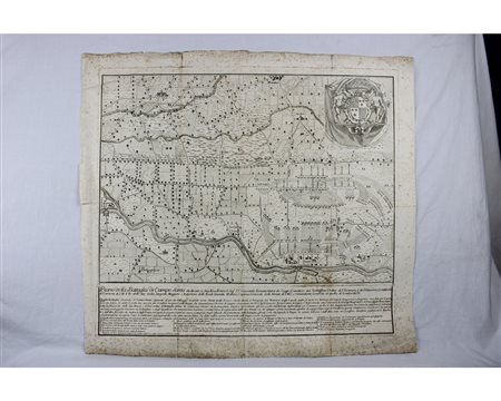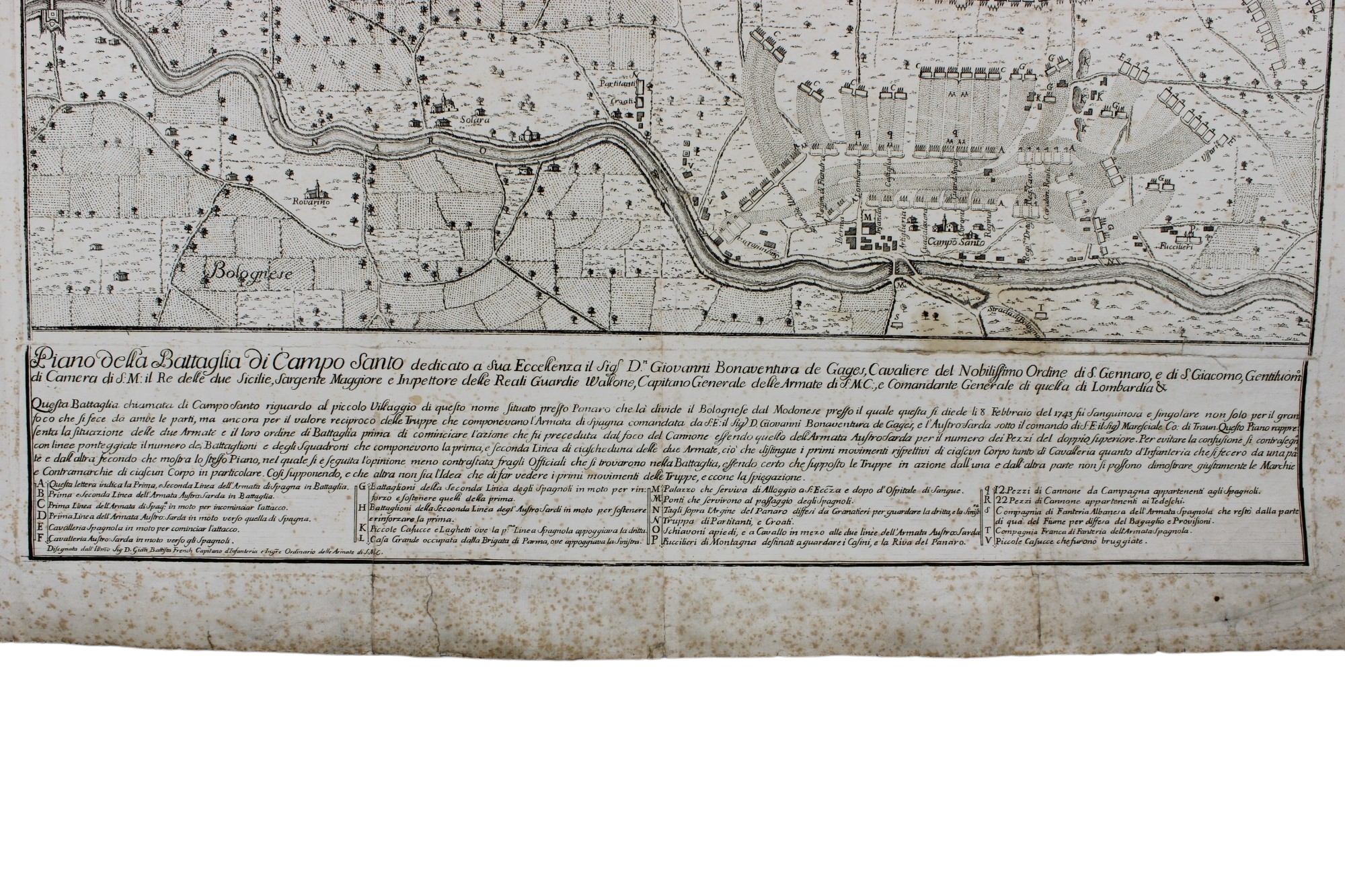 CARTINA GEOGRAFICA PIANO della battaglia di Campo Santo..situato presso Panaro (Emilia Romagna) che lo divide il Bolognese dal Modenese presso il quale si diede di 8 febbraio del 1743 una sanguinosa battaglia. … Dedica a Sua Eccellenza Sig. Giovanni Bonaventura de Cages cavaliere del nobilissimo ordine di San Gennaro e di Giacomo Gentiluomo di Camera di Sua Maestà il Re delle due Sicilie. Incisione rame h cm 60 x 68