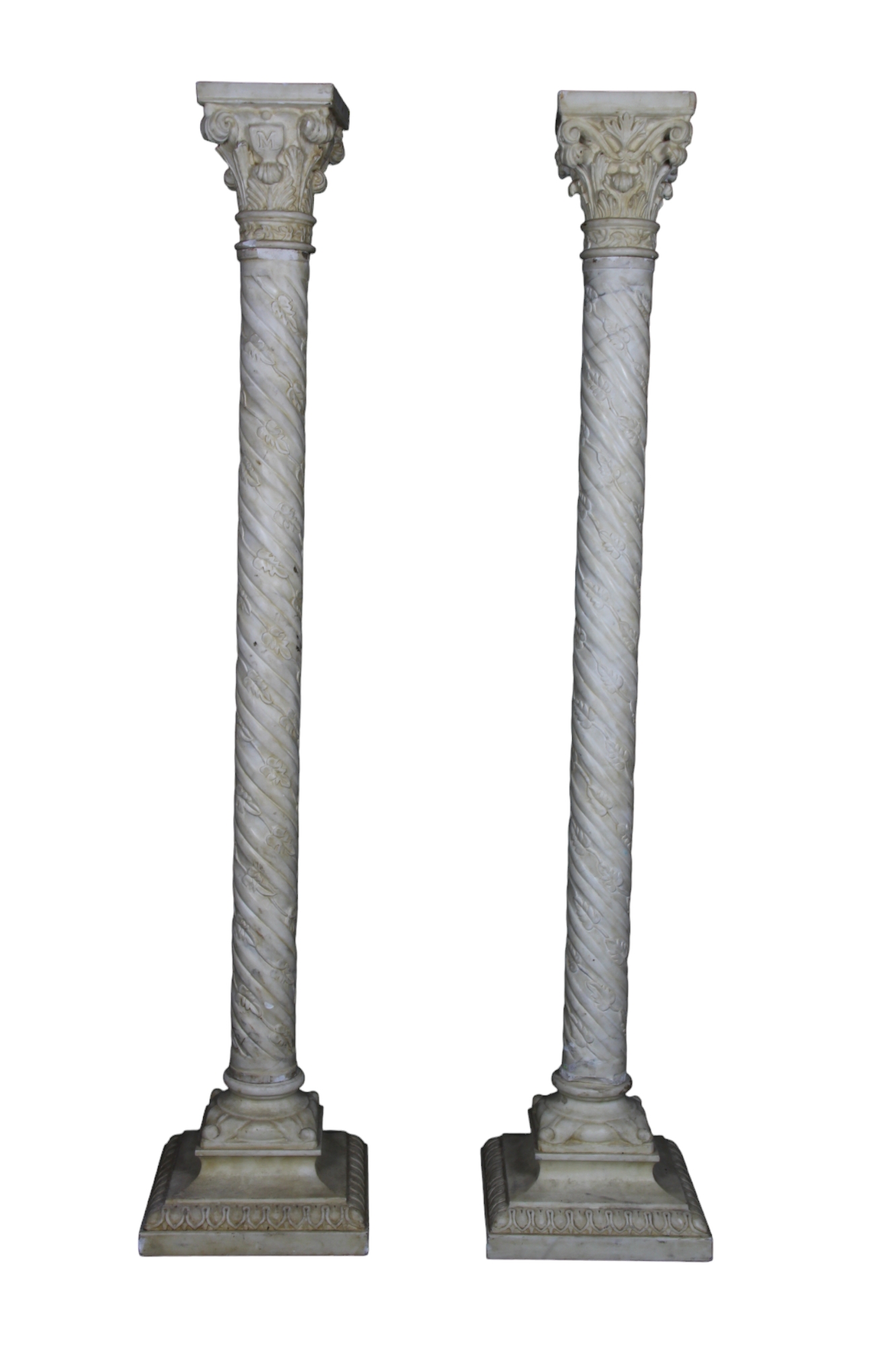 COPPIA DI COLONNE in marmo bianco di Carrara tornite e scolpite a motivi floreali con basi e capitelli corinzi manifattura siciliana fine XIX secolo h cm 132 x 36 x 36