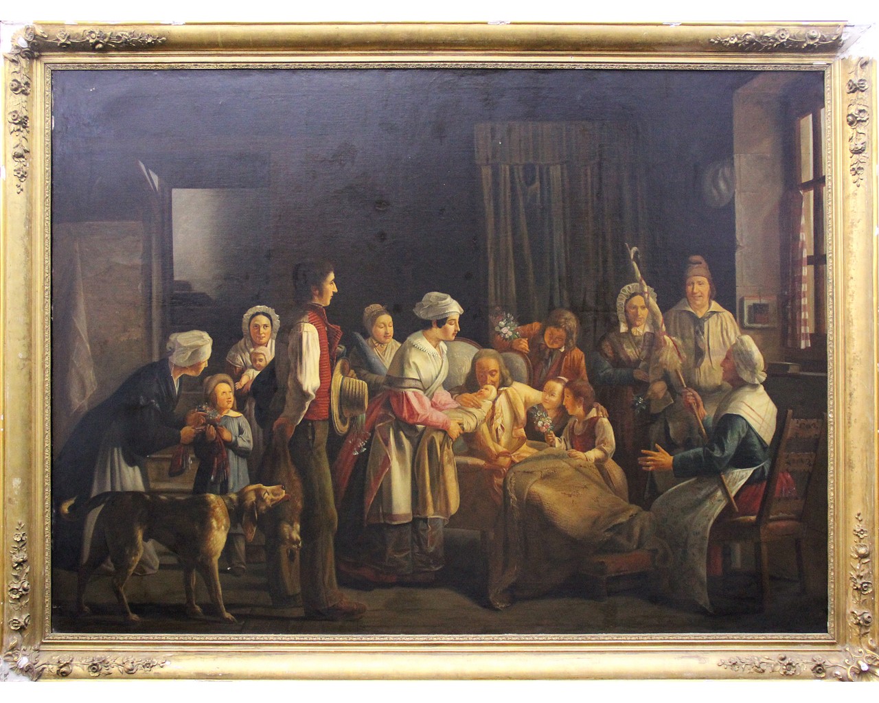 GRANDE DIPINTO OLIO SU TELA raffigurante scena di vita familiare , cornice dorata coeva Sicilia XIX secolo h cm 200 x 269