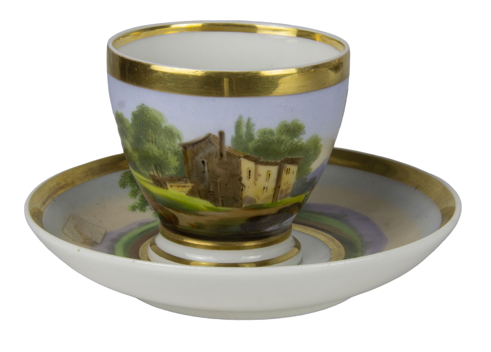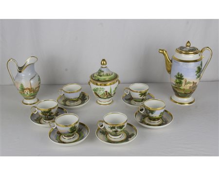 SERVIZIO DA CAFFÈ' IMPERO in porcellana bianca decorato da paesaggi composto da: 6 tazze con piattini, zuccheriera, lattiera e caffettiera Francia XIX secolo misure varie
