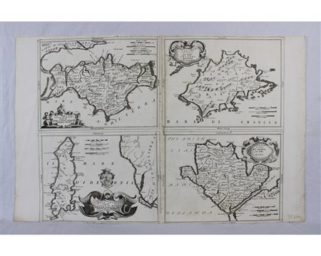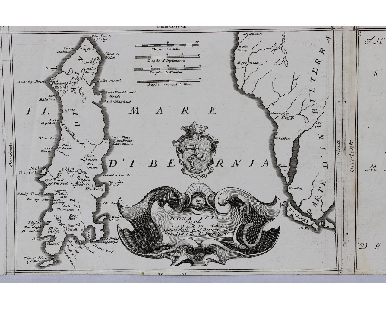 CARTINA GEOGRAFICA CORONELLI Marco Vincenzo ( 1650-1718)(Gran Bretagna)Isola di Wight nome insula hoggidì Isola di Man Jarsey isola gia detta Cesare. Anglesey isola della Inghilterra già detta Monia. Incisione rame. La carta geografica fa parte de l’atlante :” Corso Geografico Universale“. Venezia (1690-95) h cm 47 x 72,5