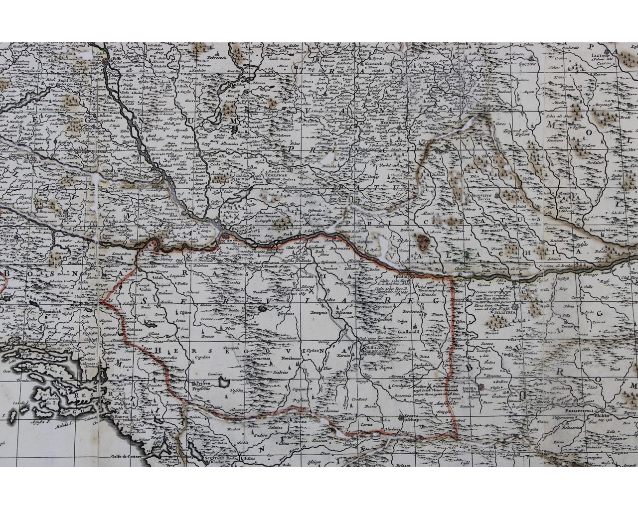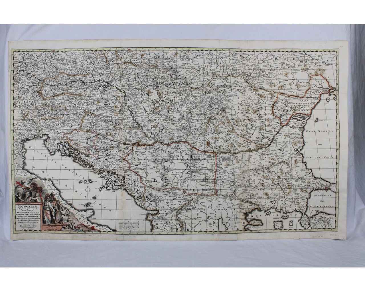 CARTINA GEOGRAFICA DE WITT Frederick ( 1630-1706 ) (Ungheria)Regni Ungariae et Regionum quae ei quondam fuere unitae…Moldaviae,Serviae, partis Danubi Fluminis novissima delineata 1688.Titolo entro cartiglio ornato da figure allegoriche. La carta è stata stampata ad Amsterdam nel 1688. Incisione rame coloritura originale d’epoca h cm 55 x 91