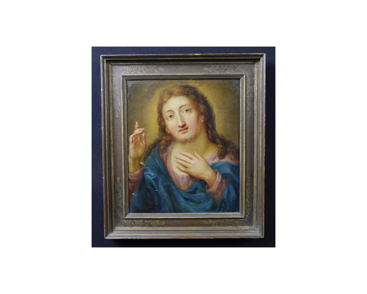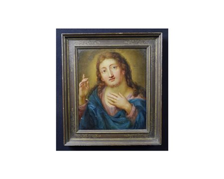 OLIO SU TAVOLA raffigurante Cristo benedicente attribuibile Johann Zeirig Gross Schenau 1737 Desdra 1806, reca sul retro Christus Scheuan 1760-1780, cornice non coeva h cm 28 x 22,5
