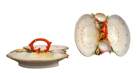 COPPIA ANTIPASTIERE in porcellana policroma a forma di valve e conchiglie Italia primi 900 h cm 30 x 30