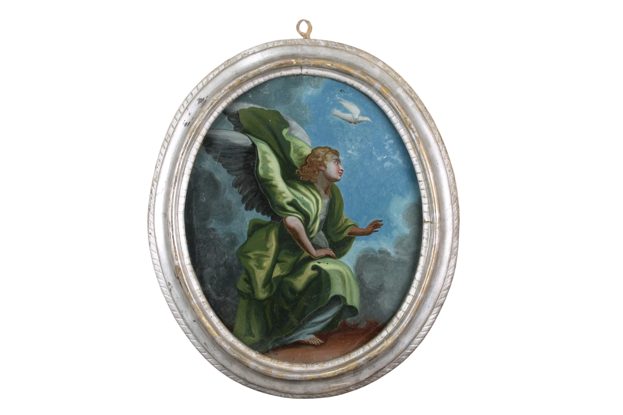 PITTURA SU VETRO DI FORMA OVALE raffigurante Arcangelo dentro cornice in legno scolpito e argentato Sicilia XVIII secolo h cm 35 x 30 / cornice h cm 42 x 36