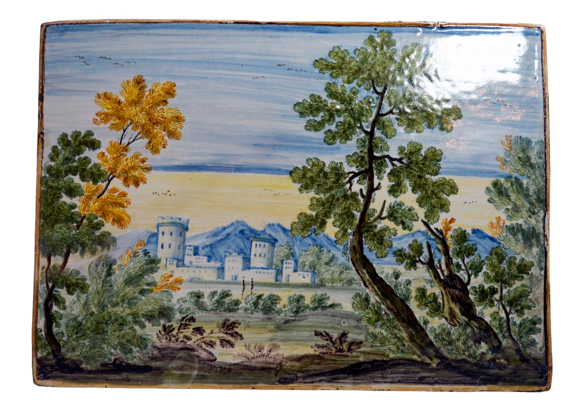 PLACCA in maiolica Castelli raffigurante paesaggio Italia XVIII secolo h cm 18 x 24