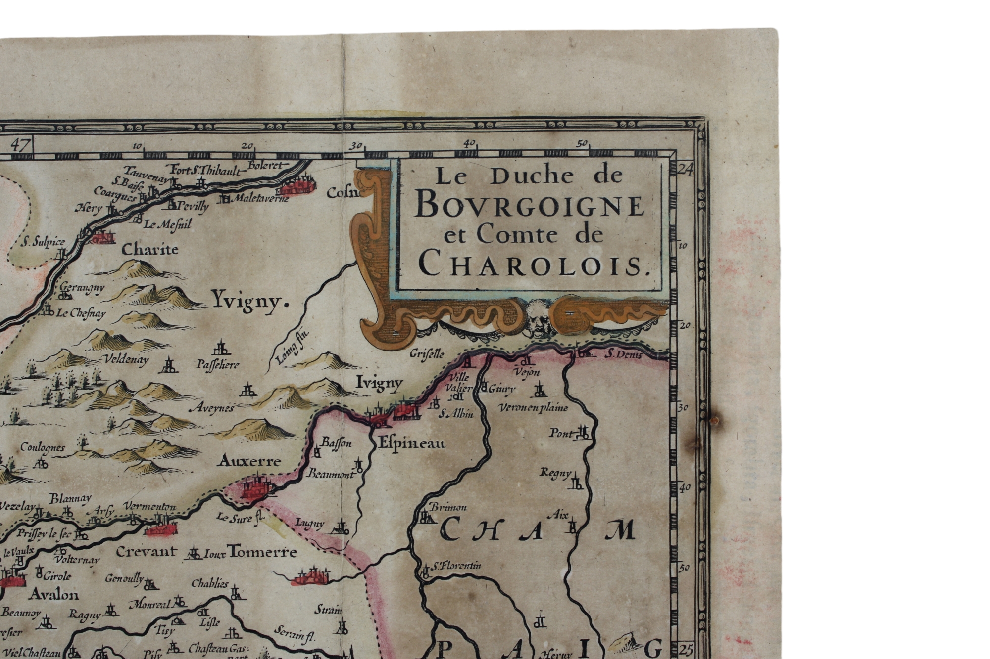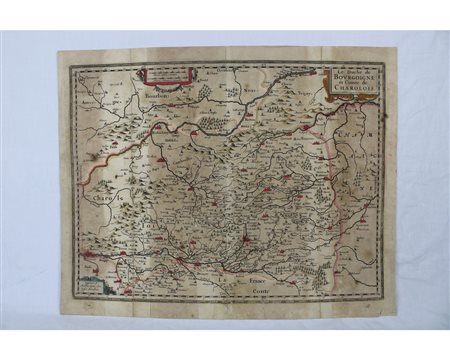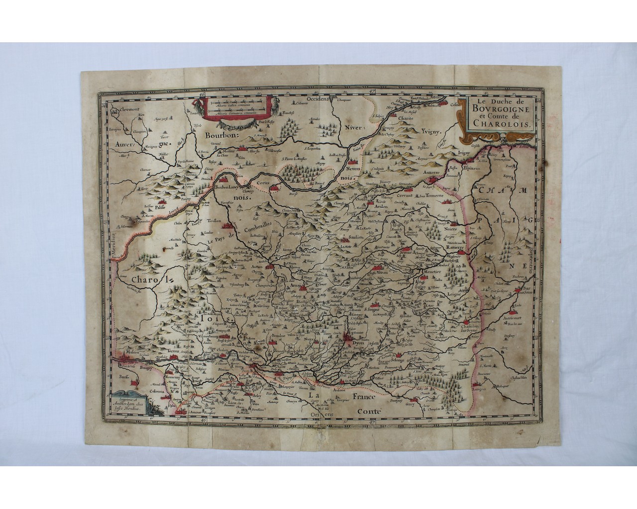 CARTINA GEOGRAFICA LE DUCHE DE BOURGOIGNE ET COMTE DE CHAROLOIS, stampata ad Amsterdam chez Iobe Hondius, Incisione rame h cm 42 x 54