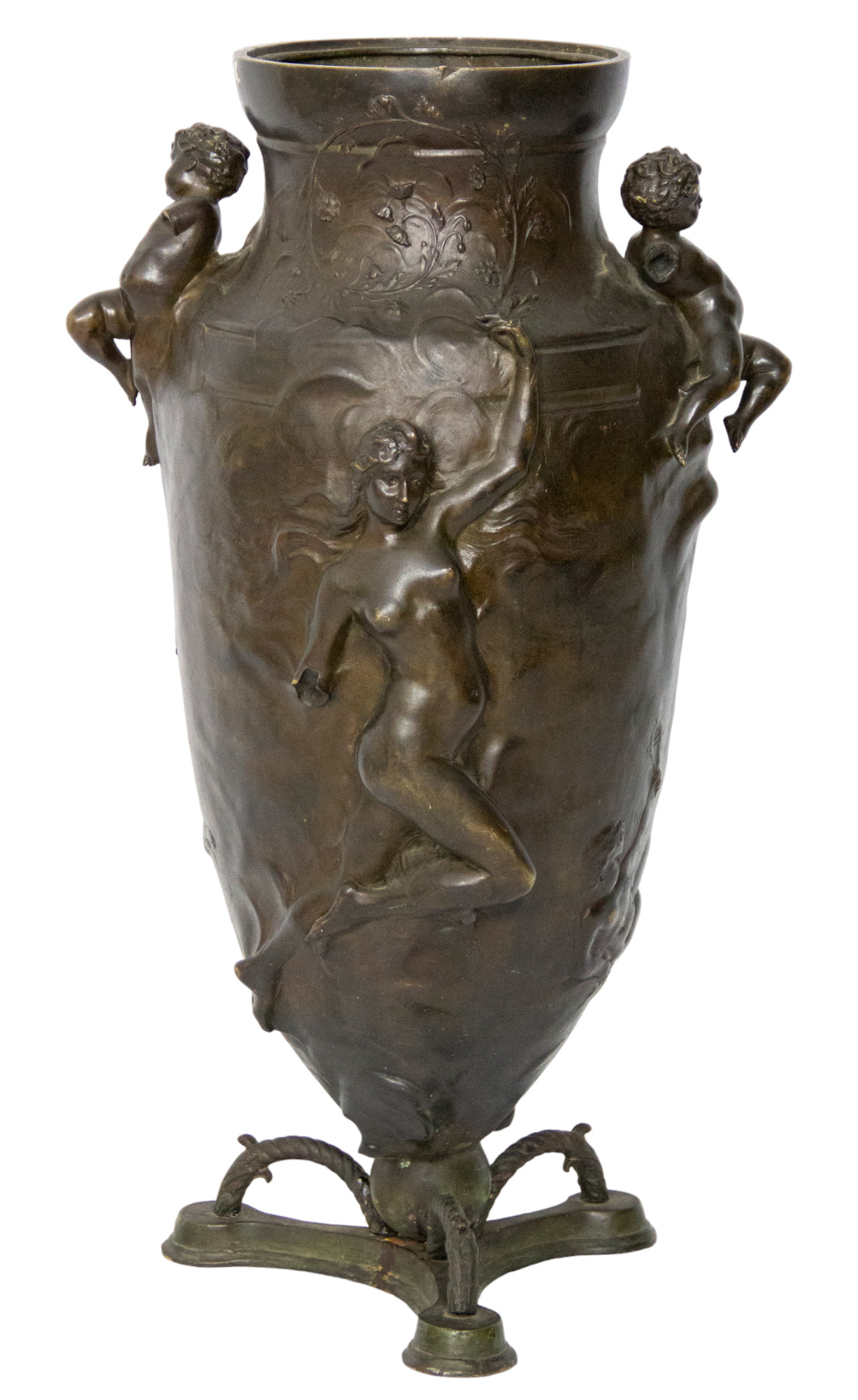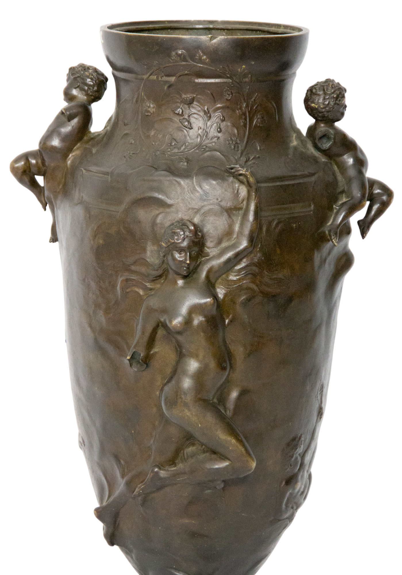 ORIGINALE VASO in bronzo patinato decorato da sculture in altorilievo raffigurante fanciulli firmato A.Pungeri Francia 1872-1944 h cm 86 x 26
