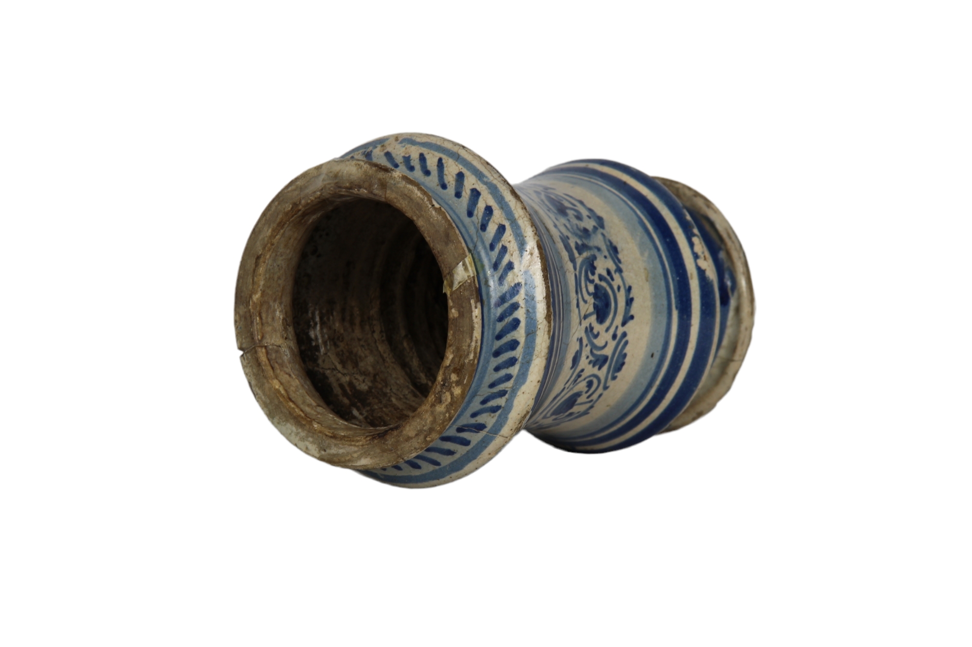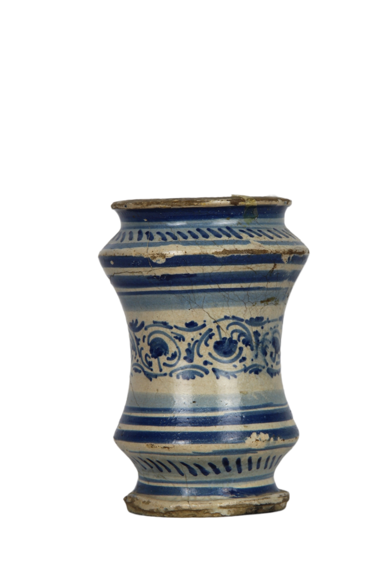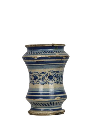 RARO PICCOLO ALBARELLO DA FARMACIA in maiolica invetriata a fondo bianco e decori blu Caltagirone 1680-1710 h cm 13 x 9
