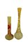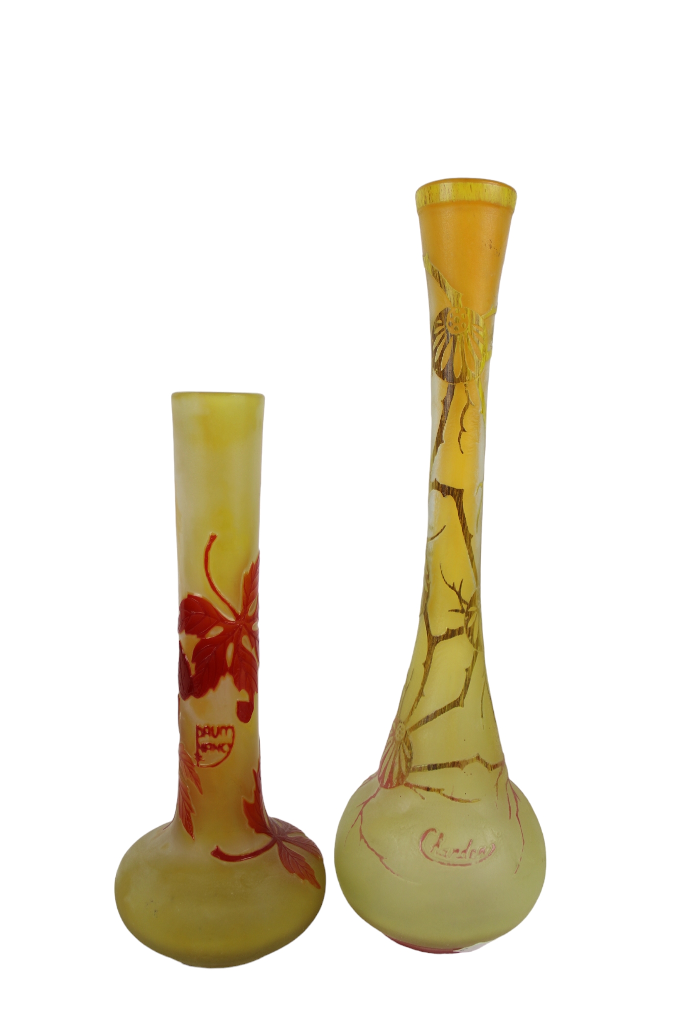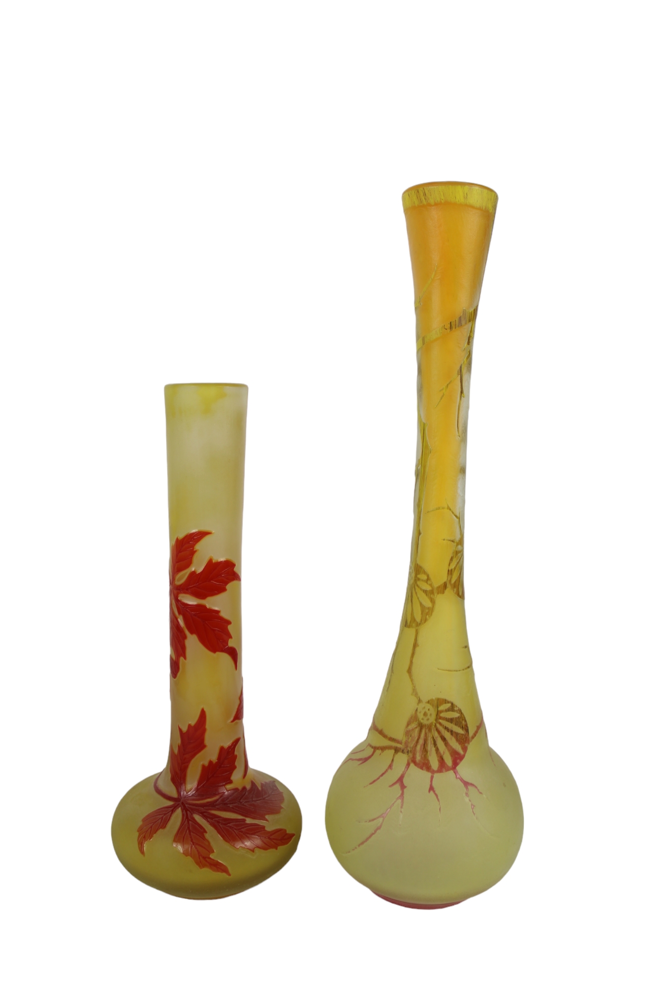 COPPIA DI VASI in vetro satinato e inciso a fondo giallo manifattura 1 Daum Nancy e 1 Chanden h cm 32,5 x 9 / h cm 24,5 x 10