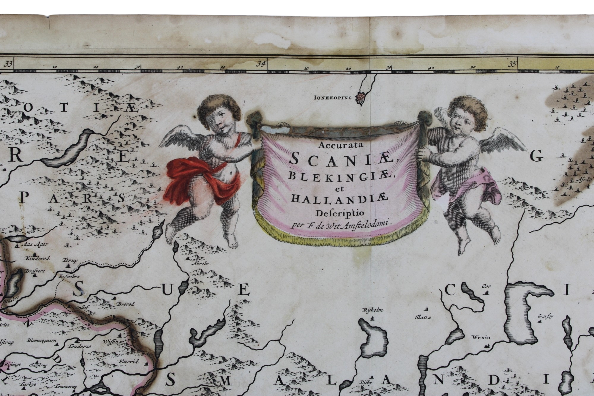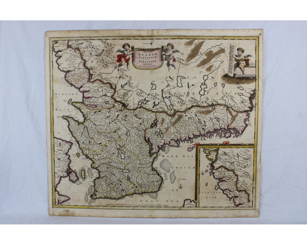CARTINA GEOGRAFICA DE WITT Frederick (1630-1706) ( Svezia Olanda …) Accurata Scaniae Blekingiae et Hollandiae descriptio. Titolo in alto al centro entro cartiglio sorretto da puttini alati. Incisione rame coloritura originale d’epoca h cm 62 x 54