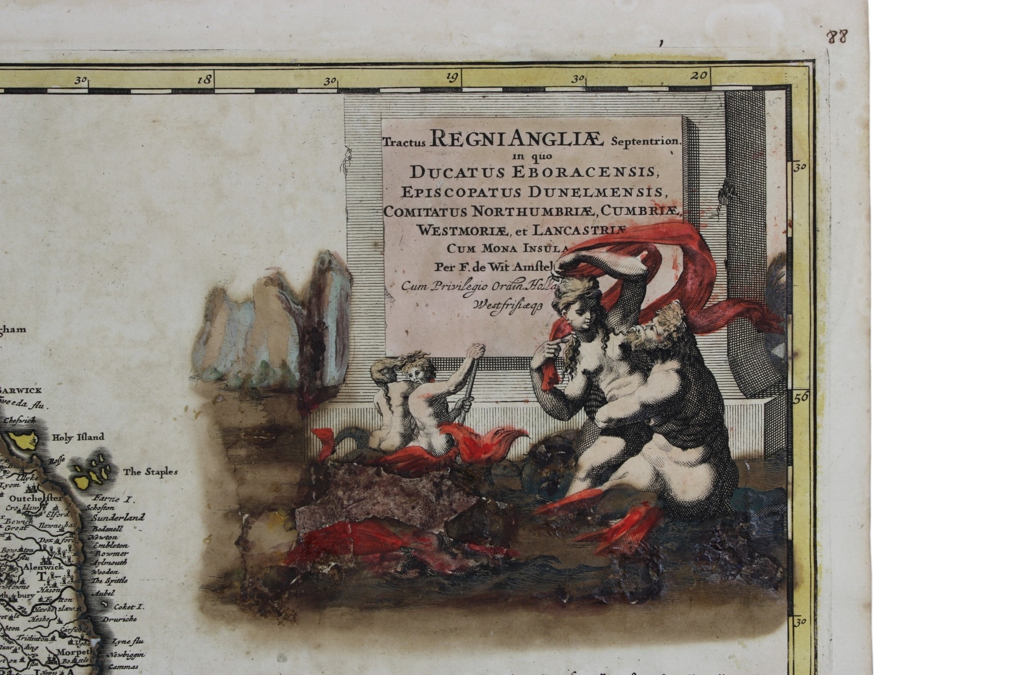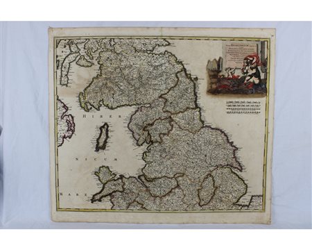 CARTINA GEOGRAFICA DE WITT Frederick (1630-1706) (Gran Bretagna) Tractatus Regni Angliae Septentrionalis… Amsterdam (1680) Grande cartiglio in alto a destra con figure allegoriche Incisione rame coloritura originale d’epoca h cm 62 x 54