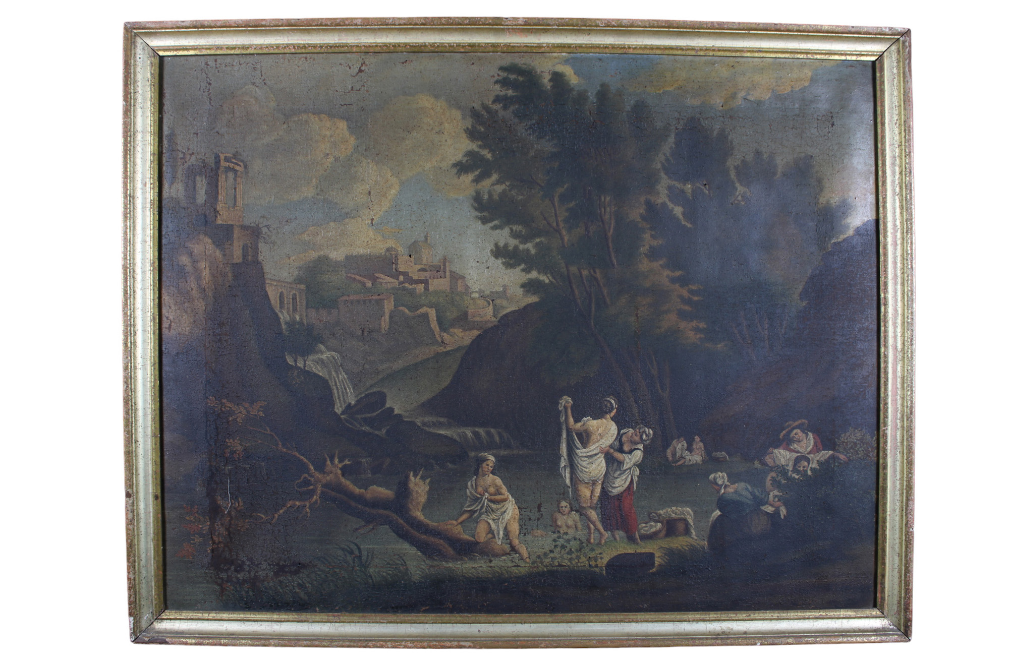 OLIO SU TELA raffigurante donne al bagno dentro cornice in legno dorato scuola italiana primi XIX secolo h cm 75 x 97