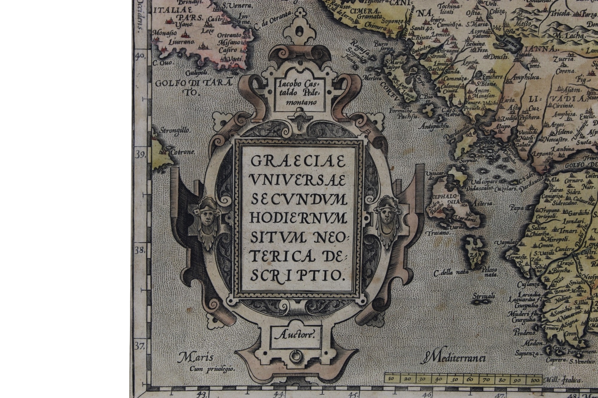 CARTINA GEOGRAFICA HORTELIUS Abraham (1527-1598) (Grecia) Graeciae Universae secundum…descriptio Jacopo Castaldo Pedemontano. Titolo in basso a sinistra entro cartiglio. Da "Theatrum Orbis Terrarum" sec XVII inc. rame h cm 37 x 51
