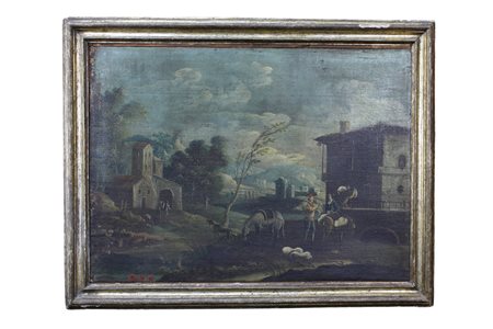 OLIO SU TELA raffigurante scorcio di paese montano con personaggi e animali dentro cornice coeva in legno dorato ad argento e mecca scuola napoletana primi XVIII secolo h cm 73 x 100 / cornice h cm 92 x 114