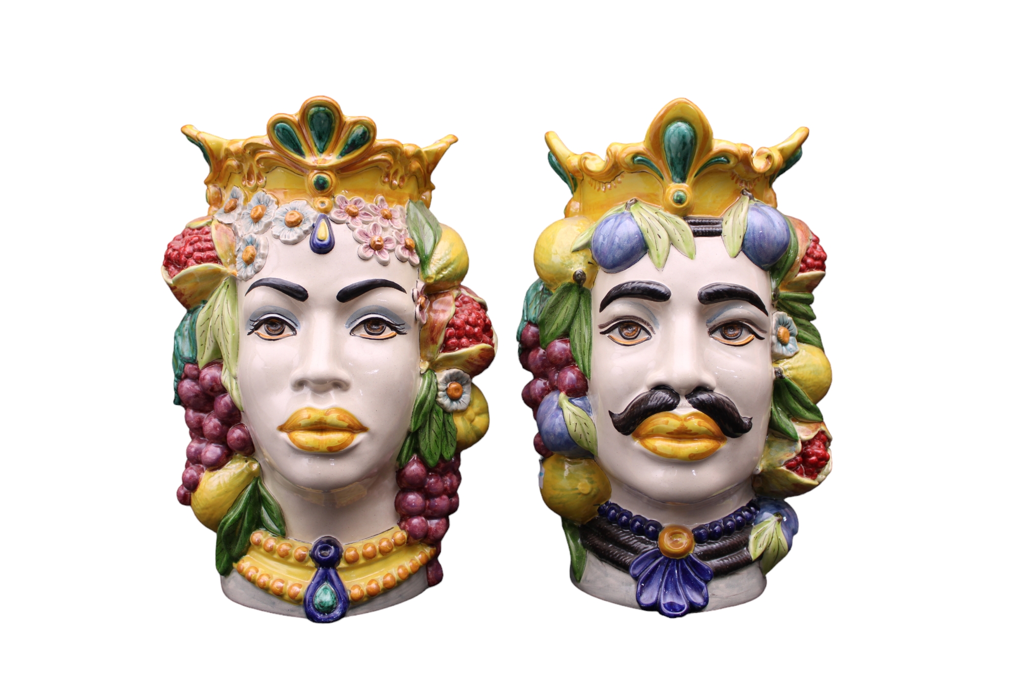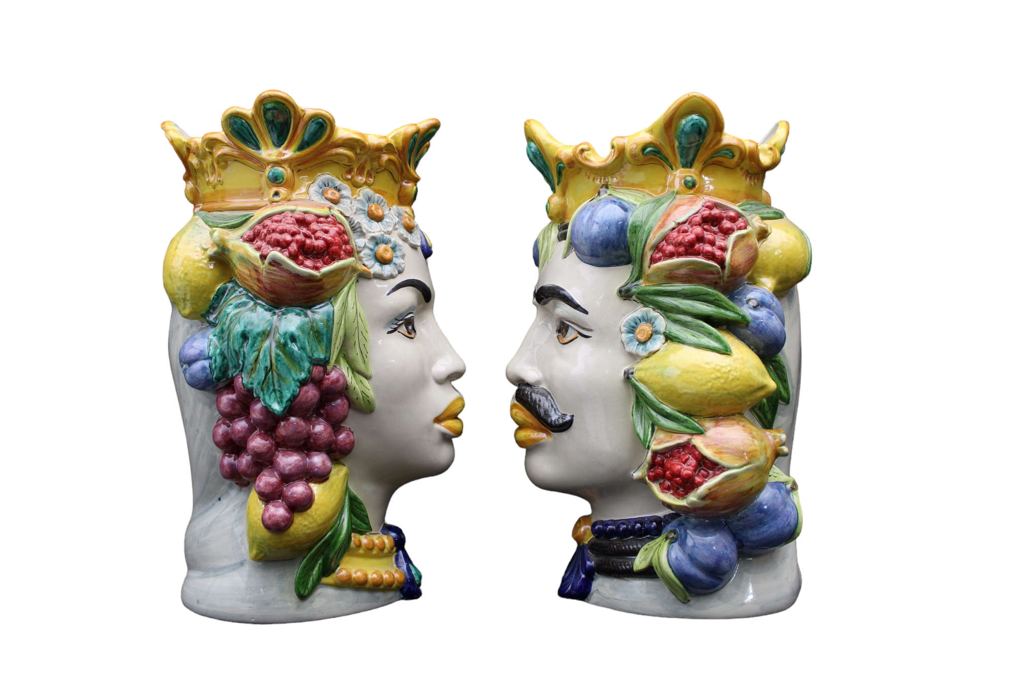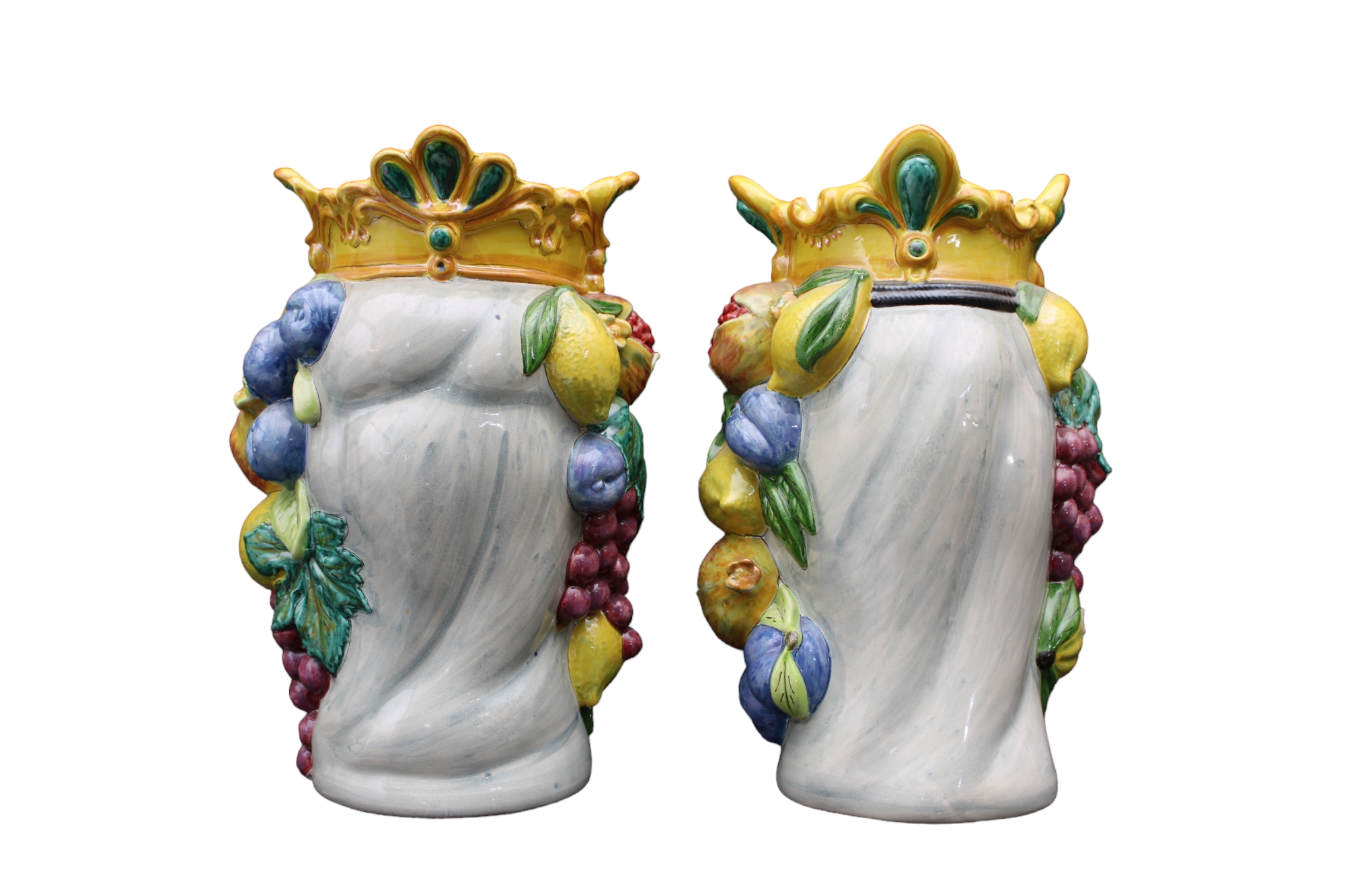 COPPIA DI VASI in maiolica policroma raffigurante teste di saraceni Sicilia XX secolo