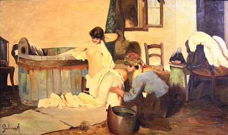 DIPINTO OLIO SU COMPENSATO Il Bagno, firmato Galione Italia XX secolo h cm 50 x 85