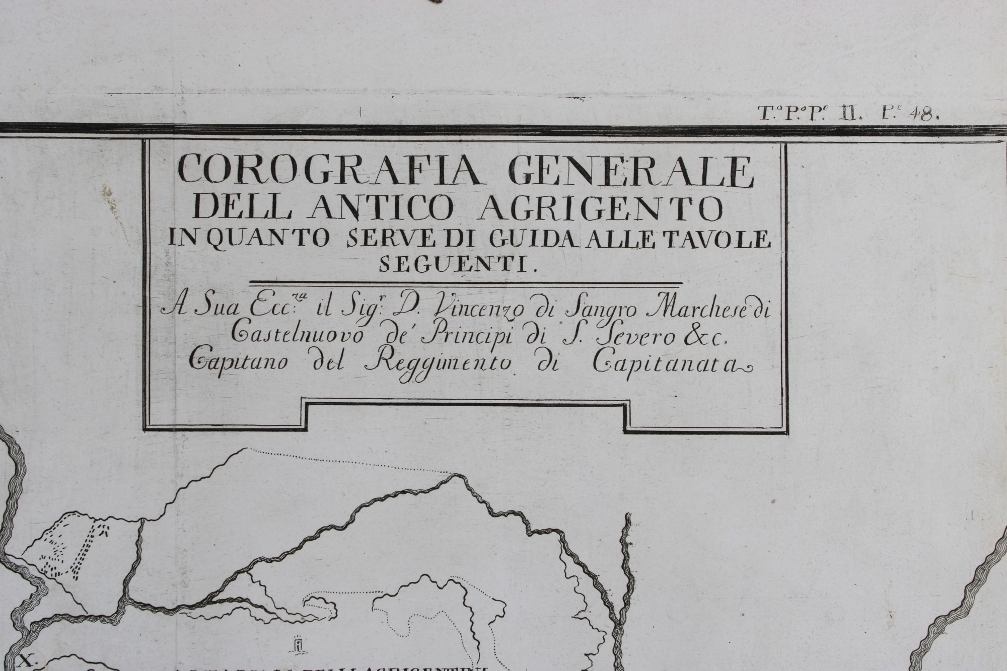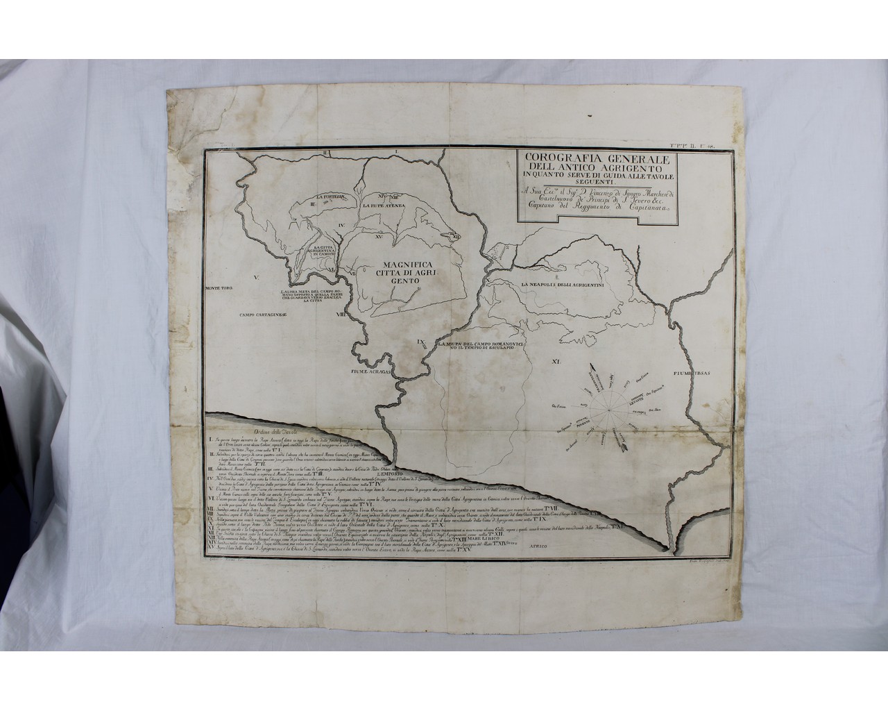 CARTINA GEOGRAFICA COROGRAFIA generale dell’Antico Agrigento. (Sicilia:Agrigento) Dedica a Sua Ecc.Sig.D.Vincenzo di Sangro Marchese di Castelniovo de Principi di S.Severo. In basso a sinistra leggenda dei luoghi ai quali fa riferimento la carta con i due fiumi Agas ad occidente e il fiume Iocas a oriente. Incisione rame Cfr. Michele Carusi. Osservazioni e note sulla topografia Agrigentina.1931 h cm 61 x 65