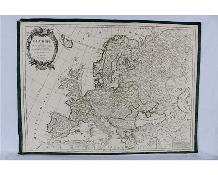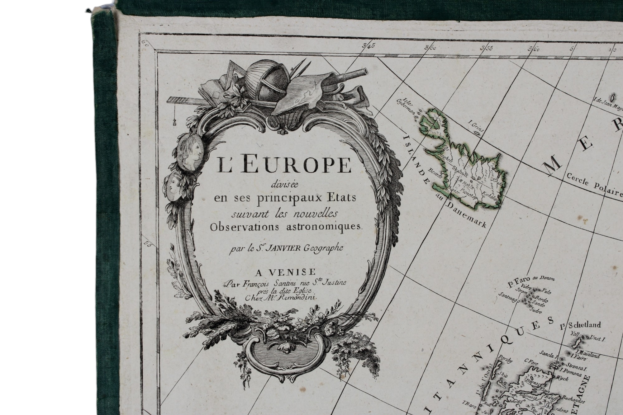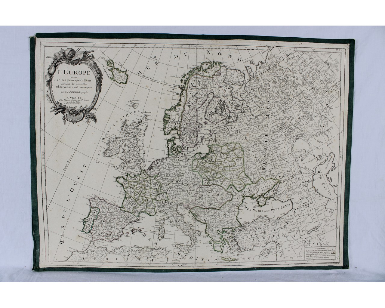 CARTINA GEOGRAFICA REMONDINI Giuseppe Antonio (nato 1634) Europa. L'Europe divisée en ses princioaux Etats souvans les nouvelles observations… par Sr. Janvier geographe. Inc. rame stampata a Venezia chez Remondini sec XVIII Carta geografica controfondata posteriormente da tela di lino (epoca 1800) h cm 50,5 x 68,5