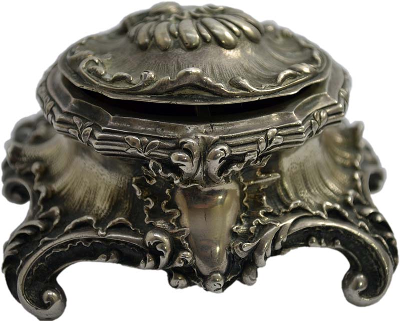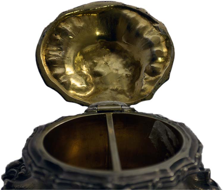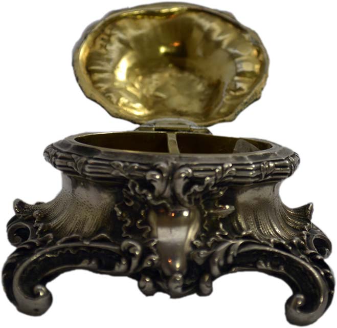 SALIERA in argento stile barocco , con ricca decorazione interna in vermeil, grammi 169 Italia XIX secolo h cm 4,5 x 8,5 x 7,5