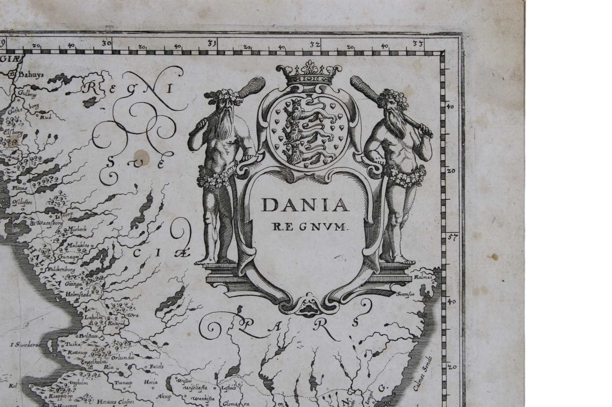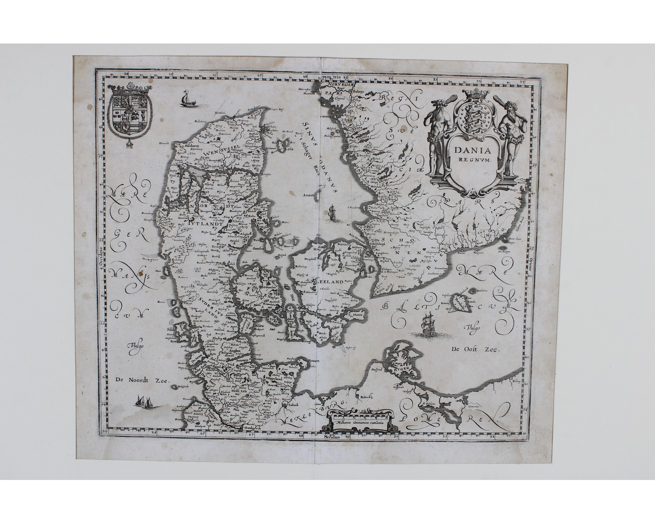 CARTINA GEOGRAFICA DANIAE Regnum (Danimarca) Titolo in alto a destra arricchito da stemma real e due figure allegoriche. Inc. rame sec. XVII h cm 31 x 37