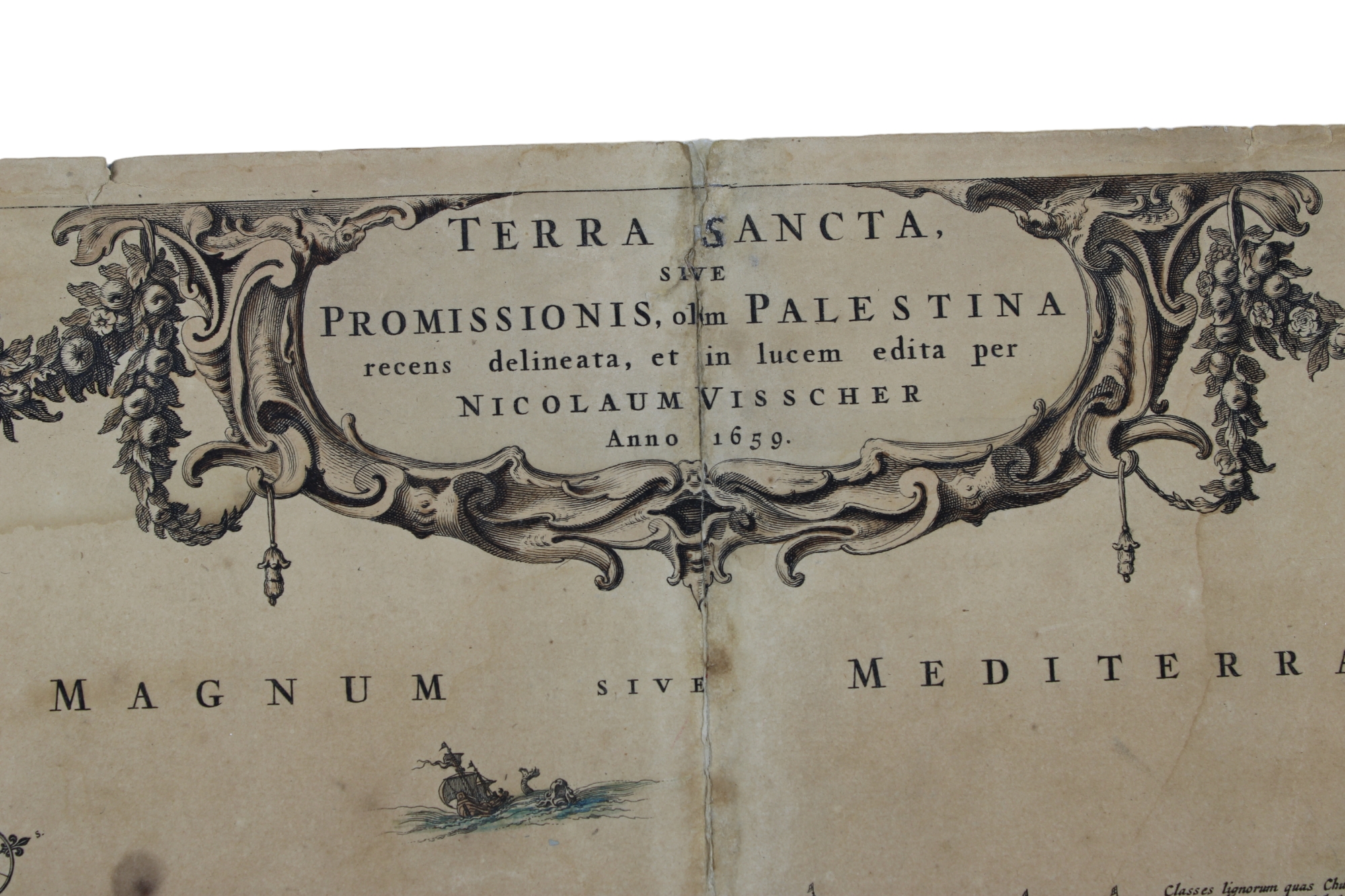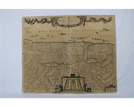 CARTINA GEOGRAFICA VISSCHER Nicolaus (Amsterdam 1618-1709)( Palestina) Terra Sancta sive Promissionis olim Palestina recens delineata…1659. Titolo in alto al centro entro cartiglio decorato con puttini che sostengono ghirlande, tranci di fiori e frutta. Incisione rame. Nicolaus Visscher fu un importante stampatore incisore editore olandese del “Siglo de Oro”del VI e XVII secolo h cm 48 x 58