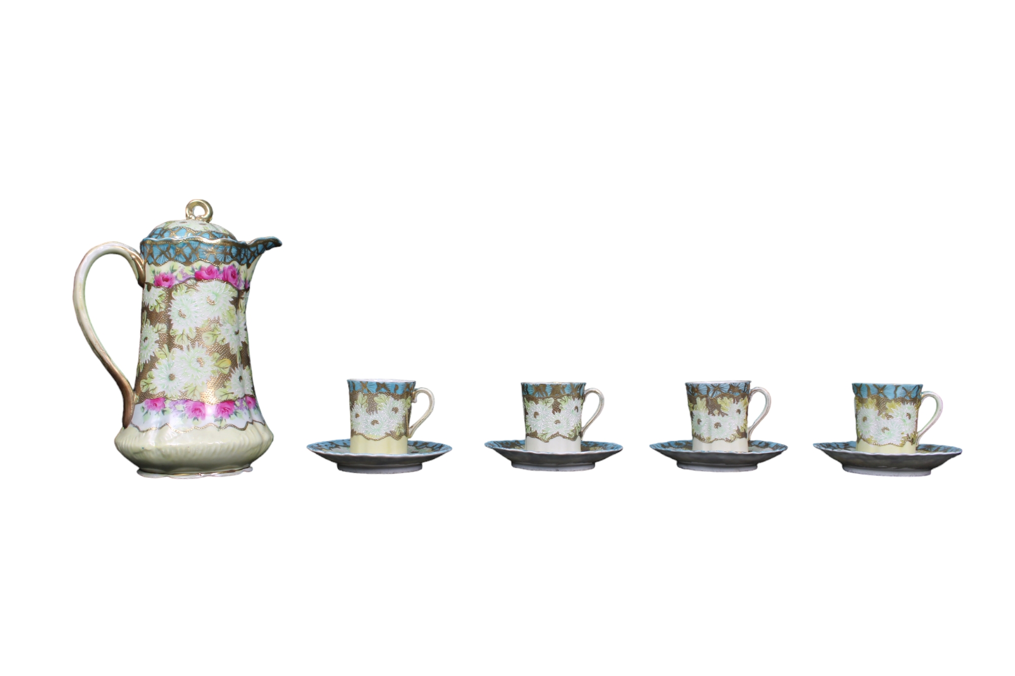 LOTTO COMPOSTO DA 1 caffettiera e 4 tazze in porcellana dipinta con lumeggiature in oro manifattura orientale XX secolo misure varie