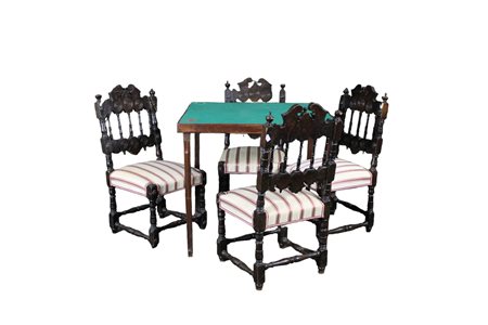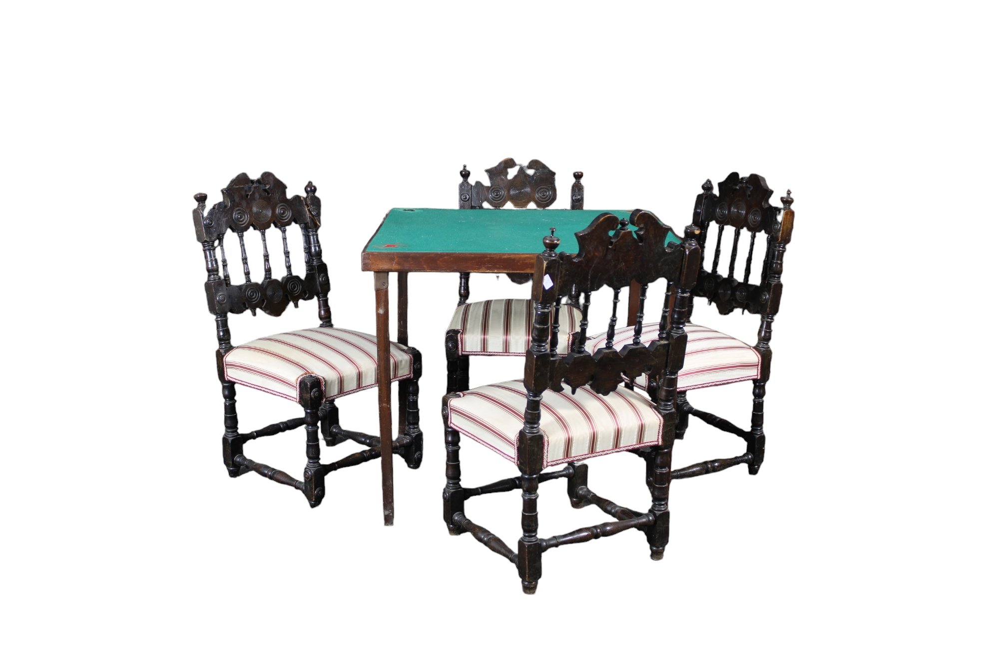 LOTTO COMPOSTO DA 4 sedie a rocchetto in legno di noce con seduta imbottita in stoffa di gusto ispanico XIX secolo e 1 tavolino da gioco richiudibile in legno con piano in tessuto verde XX secolo