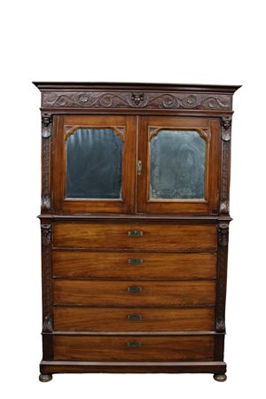 CHIFFONIER in legno di palissandro parte inferiore a 5 cassetti parte superiore a 2 sportelli arricchita da lesene in legno intagliato raffigurante figure femminili Sicilia XIX secolo h cm 208 x 138 x 55