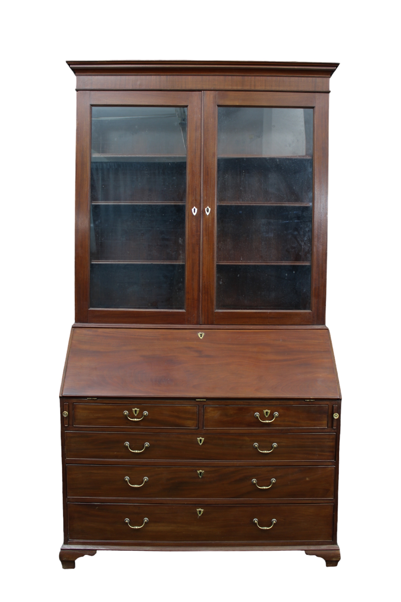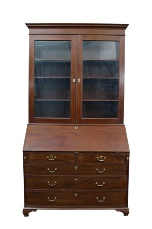 TRUMEAU A DOPPIO CORPO in legno di mogano parte inferiore a 4 cassetti grandi e 2 più piccoli con ribalta contenente scarabattolo parte superiore a 2 ante a vetro Inghilterra seconda metà XIX secolo h cm 127 x 126 x 54