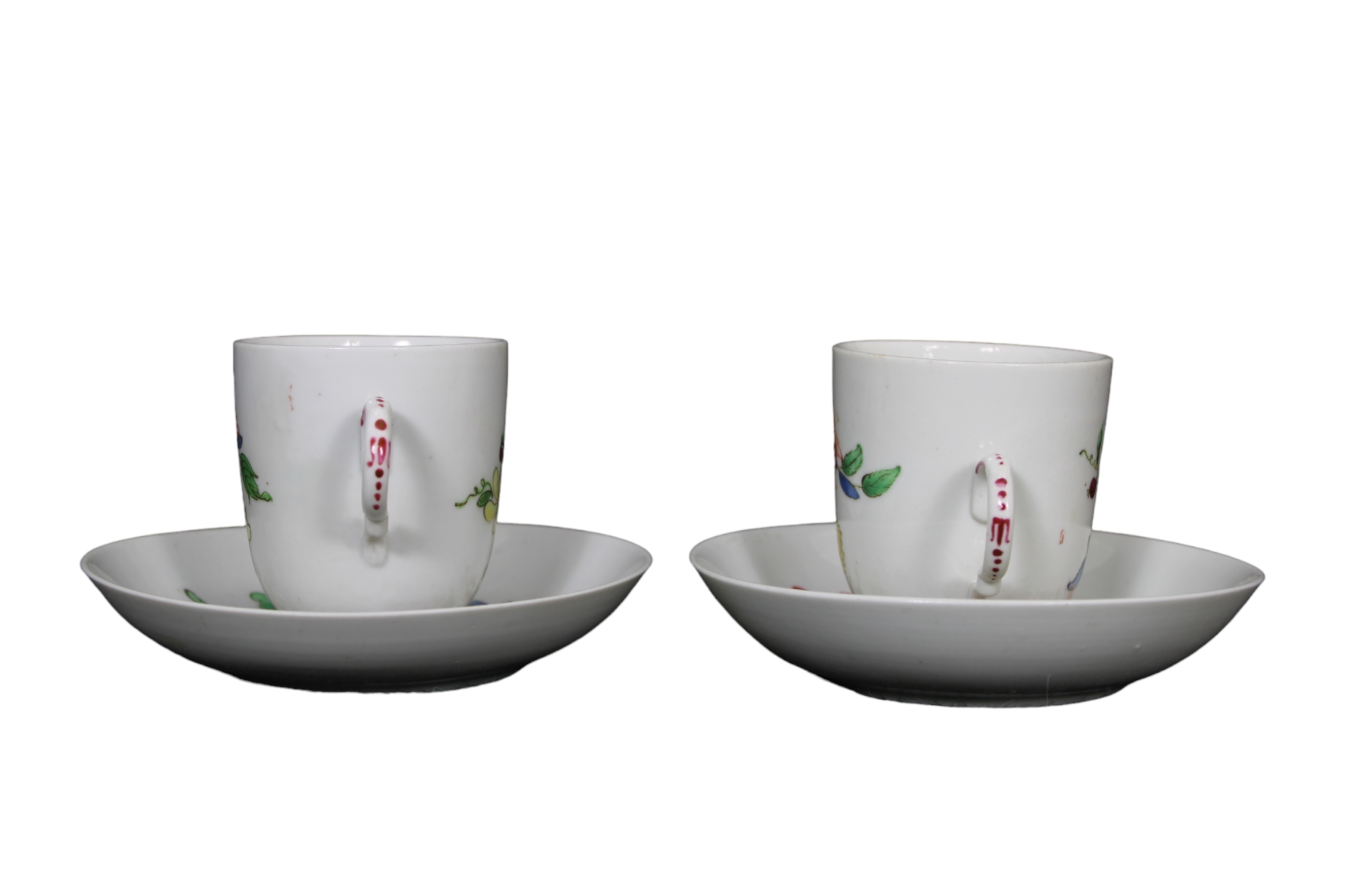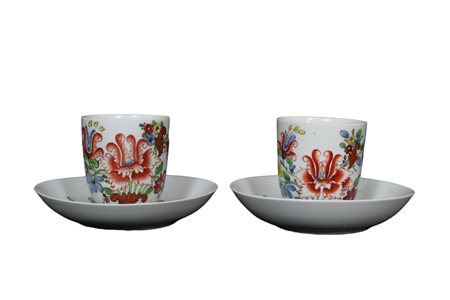 COPPIA DI TAZZINE CON PIATTINI in porcellana bianca decorata a motivi floreali e lumeggiature in oro manifattura Ginori XVIII secolo misure varie
