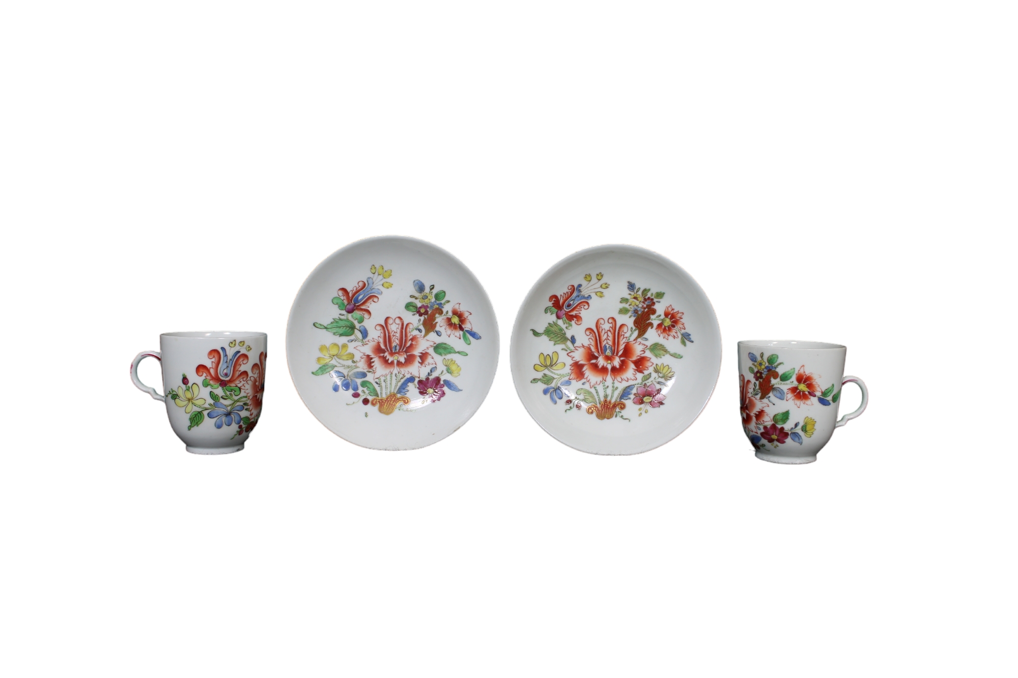 COPPIA DI TAZZINE CON PIATTINI in porcellana bianca decorata a motivi floreali e lumeggiature in oro manifattura Ginori XVIII secolo misure varie
