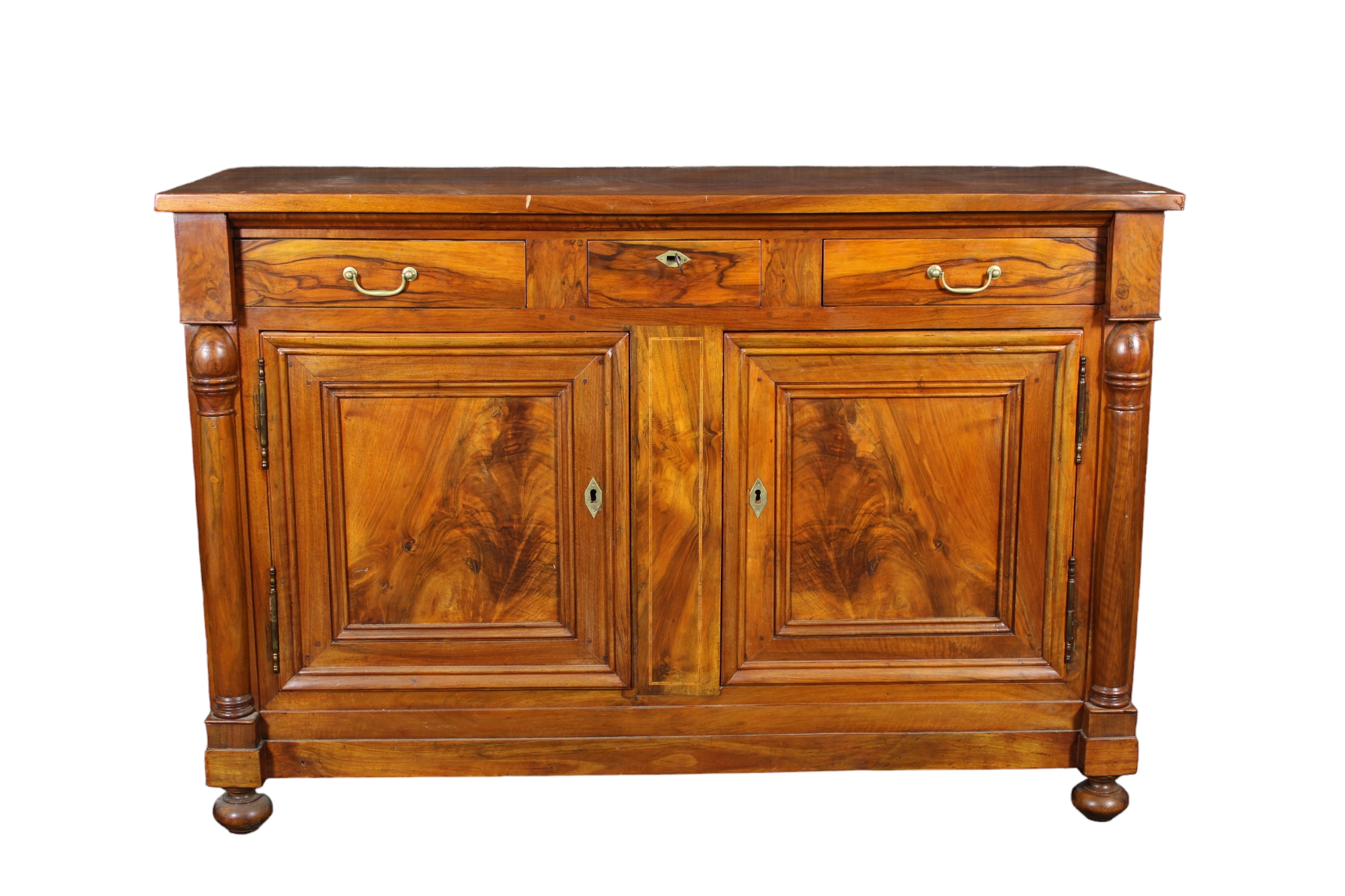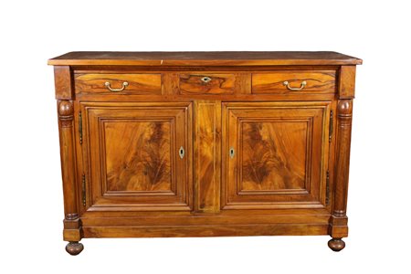 CREDENZA IMPERO in noce massello a 2 ante e 3 cassetti con colonne laterali e piedi a cipolla Italia prima metà XIX secolo h cm 108 x 160 x 60